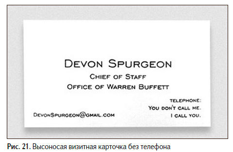 Хотя исключения всегда были, есть и будут. Отдельные счастливчики могут позволить себе нарушать все мыслимые правила, поступать вопреки здравому смыслу и все равно в итоге выходить победителями. Вы слышали такое имя – Уоррен Баффет? Для людей, далеких от финансов и глобальной политики, скажу, что это один из самых влиятельных инвесторов в мире. Я не знаю, как выглядит его визитка. Предлагаю вам составить свое суждение о ней по визитке его ассистентки по персоналу (рис. 21). Эта дама явно довольна собой и своим положением в этом мире. Номер телефона на её визитке демонстративно отсутствует. В том месте, где обычно его печатают, мы читаем: «Не звоните мне. Это я позвоню вам».