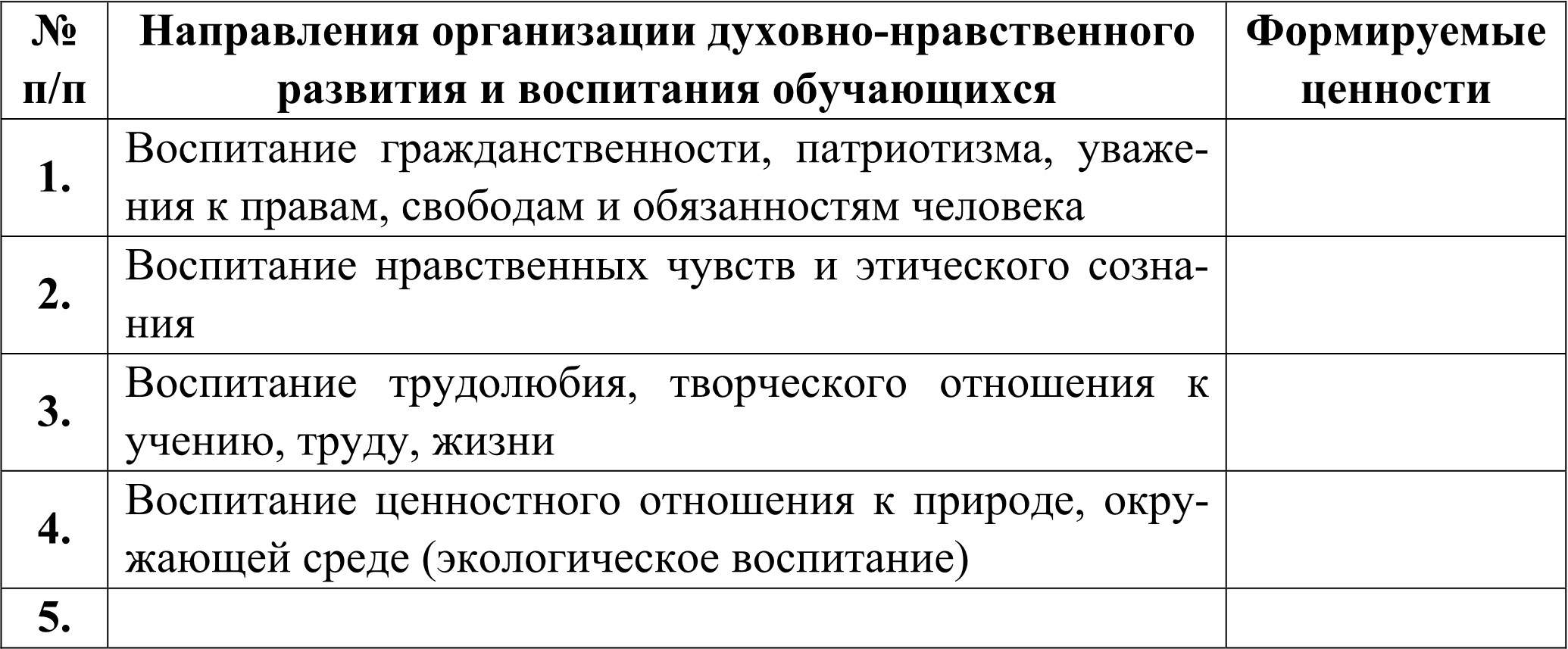 Допишите направления организации духовно-нравственного развития и воспитания обучающихся и формируемые ценности
