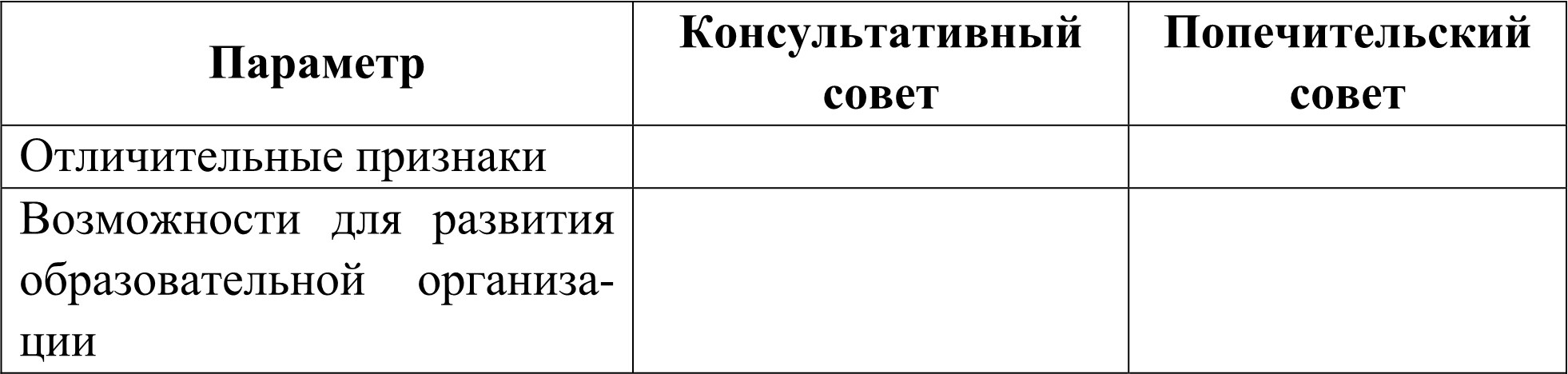 2. На основе сравнительной характеристики консультативного, попечительского советов как формы социального партнёрства заполните таблицу:
