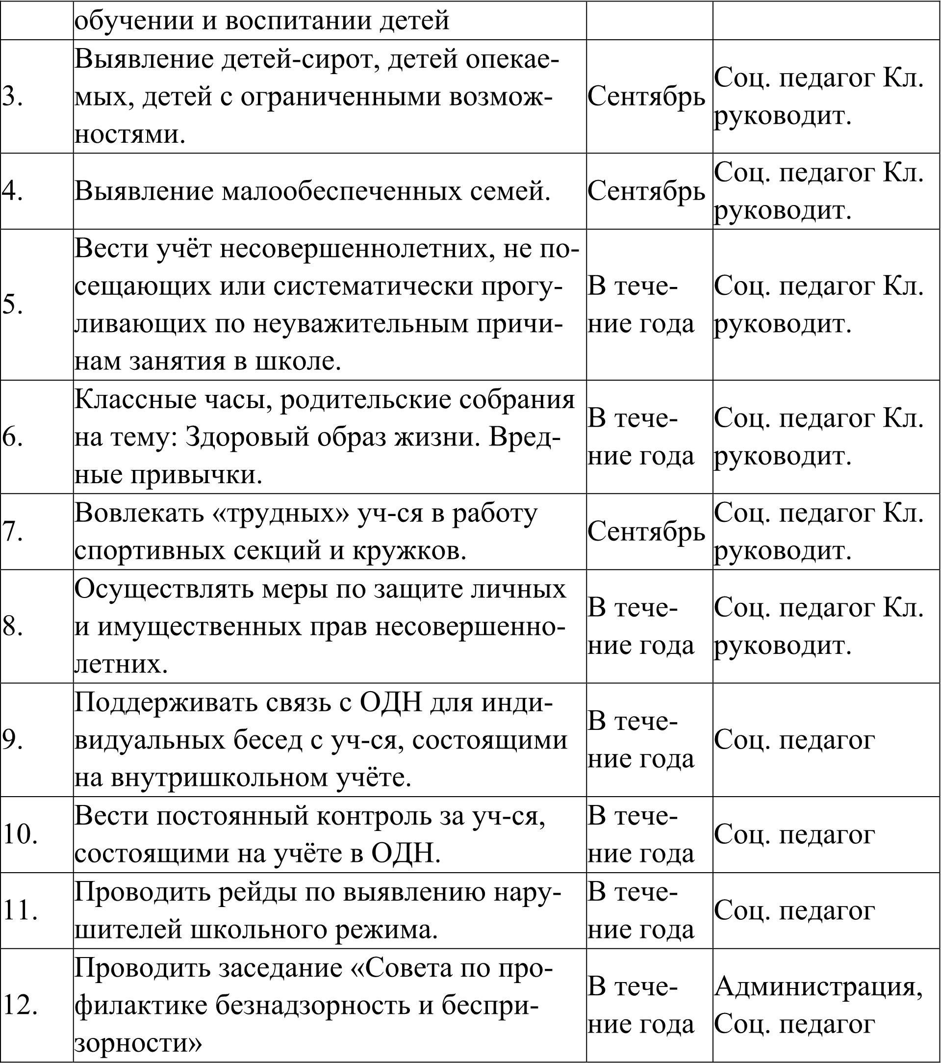 Социальный педагог проводит семинары, участвует в плановых оперативных совещаниях, педсоветах, где привлекает к профилактической работе классных руководителей и учителей предметников. В каждом классном журнале находится план-сетка мероприятий проводимых в классе и школе в течение года, в котором классный руководитель отмечает участие детей в массовых мероприятиях, что помогает контролировать детей группы риска. Социальный педагог раз в 2 недели (при необходимости чаще) встречается с классными руководителями для обсуждения возникших проблем.