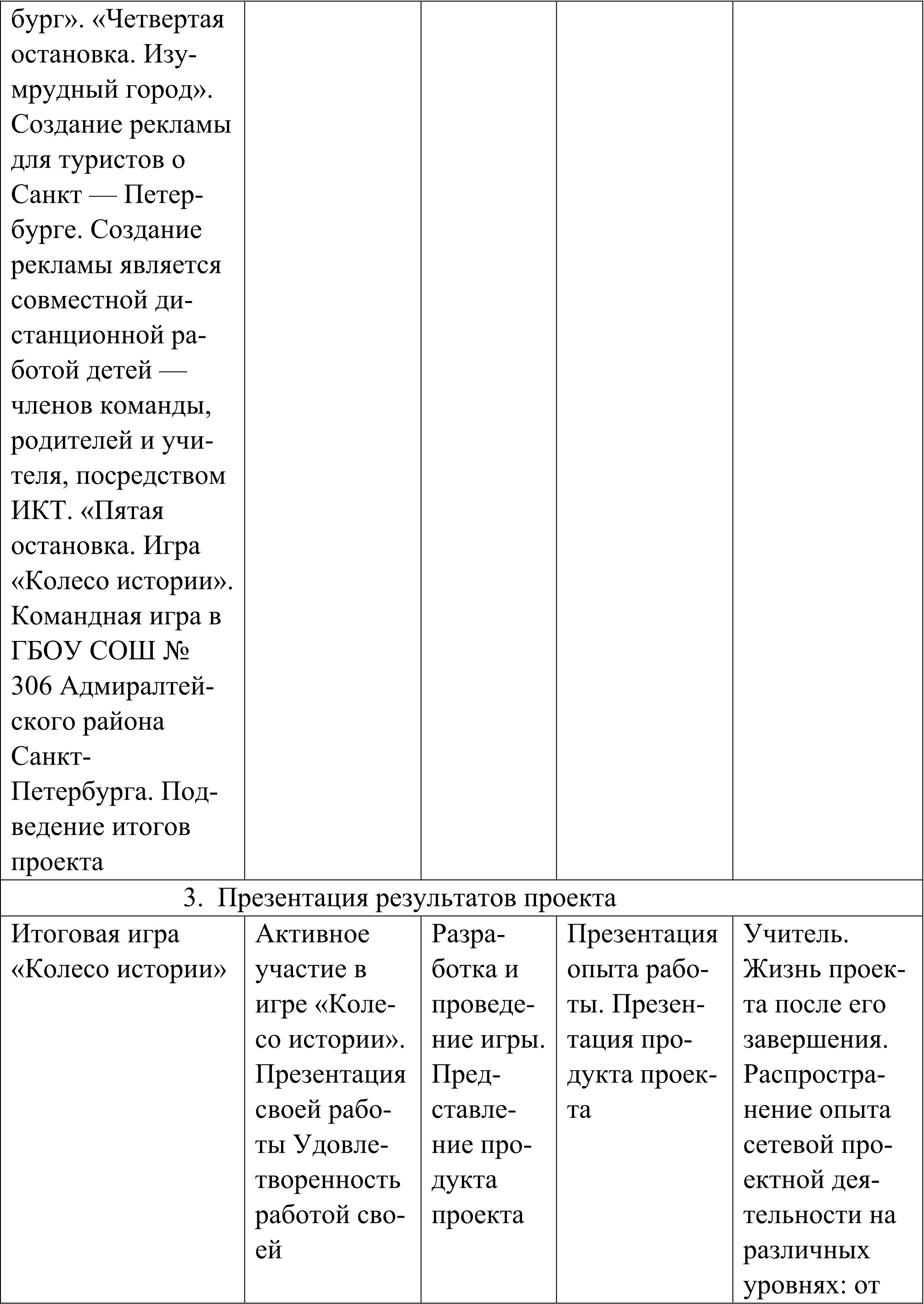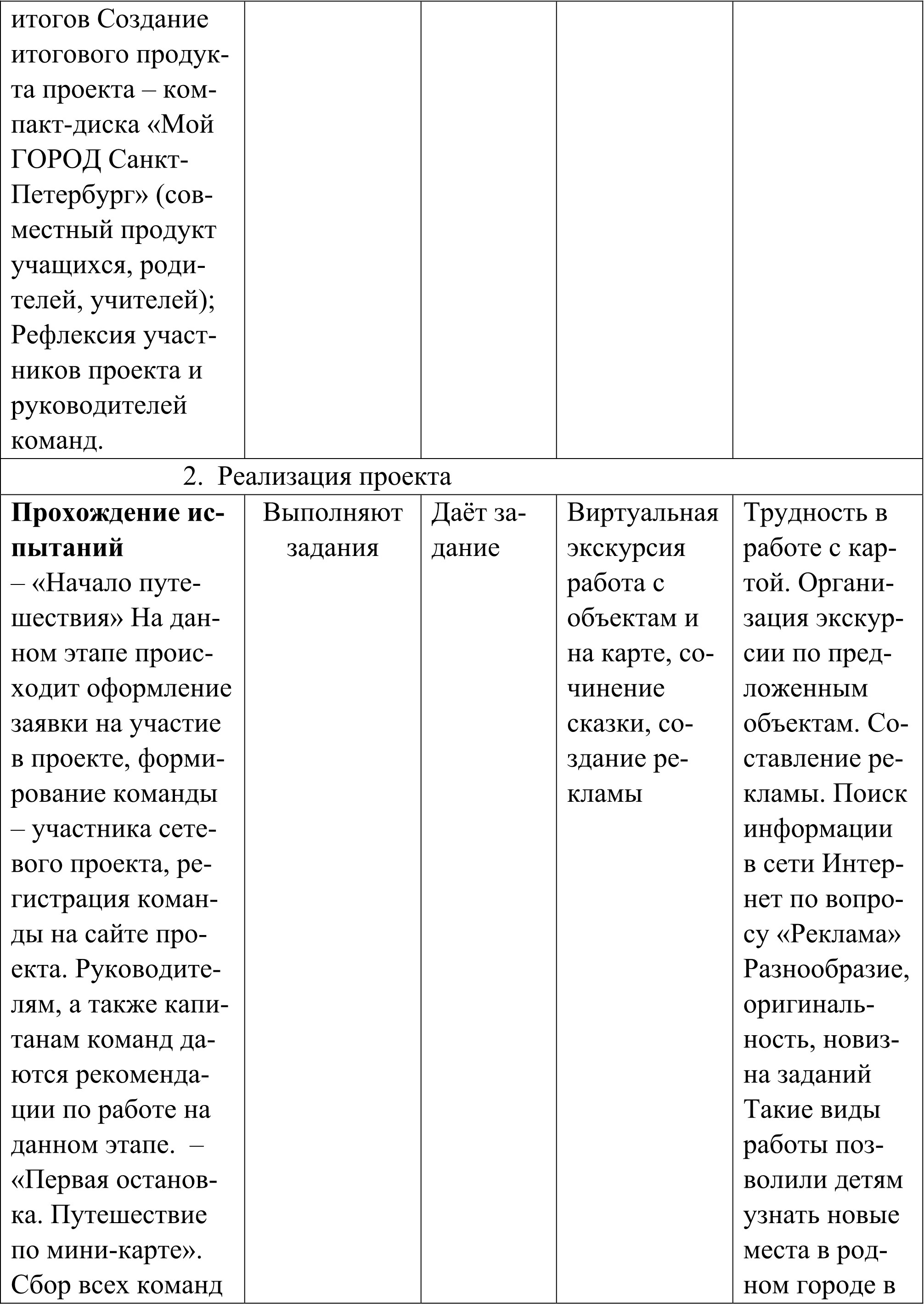 Результатом такого сотрудничества, а соответственно и итоговым продуктом сетевого проекта было создание компакт-диска «Мой ГОРОД Санкт-Петербург», в который были включены лучшие командные работы: «Рекламы о Санкт-Петербурге» и «Сказки об архитектурных памятниках». Социальное партнёрство проявило себя в обмене опытом, в совместной реализации учебно-исследовательского проекта и социальных инициатив. Такая деятельность расширила круг общения всех участников сетевого проекта, позволила учащимся и педагогам получить определённый социальный опыт.