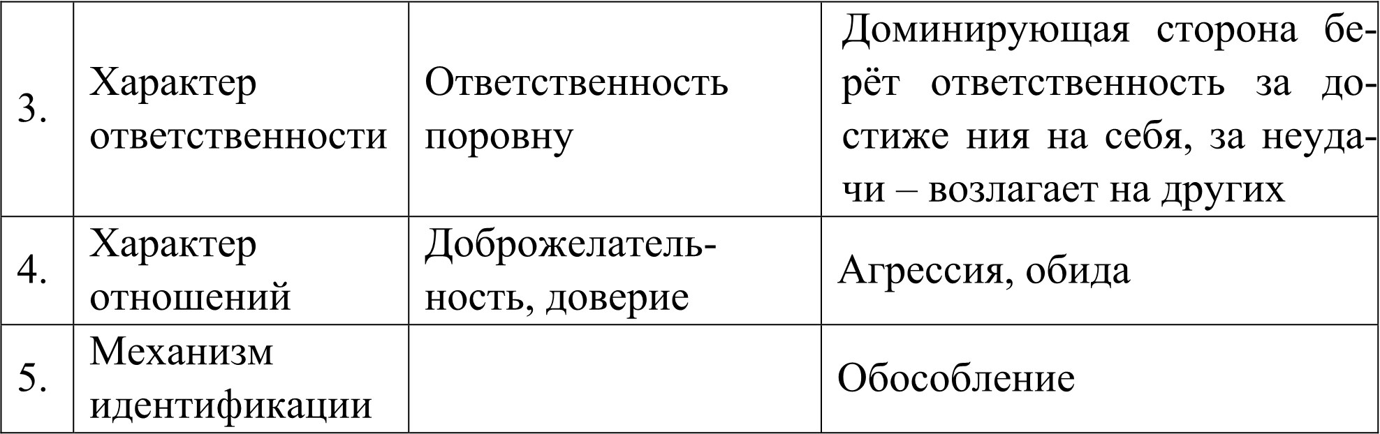 – характер ответственности: продуктивный – ответственность поровну; непродуктивный – доминирующая сторона берёт ответственность на себя;