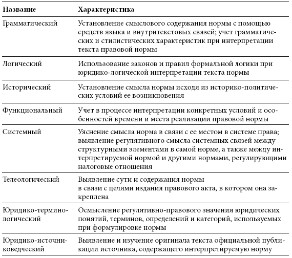 Толкованием нормы называется деятельность субъектов права по уяснению содержания нормы для самого субъекта права («толкование для себя») и разъяснению этого содержания для других субъектов. Для толкования налоговых норм применяются те же способы (приемы), что и для норм других отраслей права – грамматический, юридико-терминологический, исторический, логический, функциональный и др. (табл. 1). Охарактеризуем более подробно ряд особо востребованных из них при толковании налоговых норм.