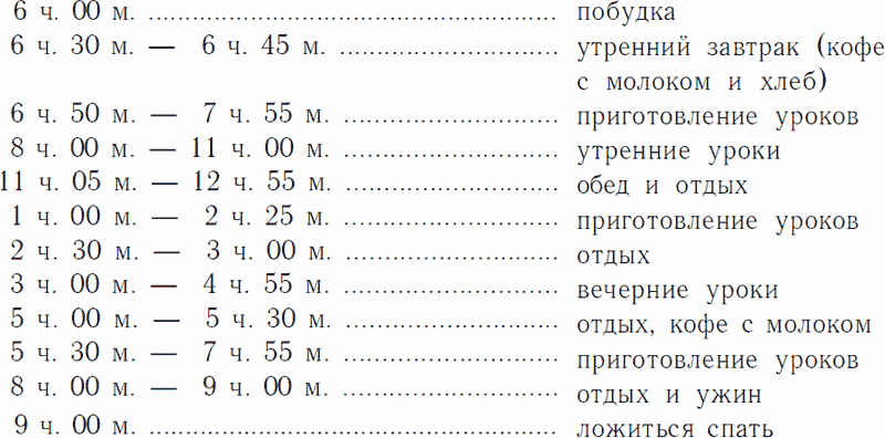 Как видно, пансионер был занят кругло 11 часов в день, имея свободного времени, считая обед и ужин, 4 часа.