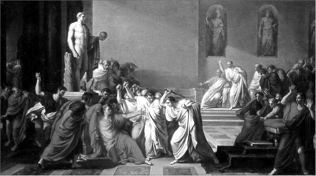 В сенате Цезарь занял свое почетное кресло, его все приветствовали. Сенаторы уселись на свои места. Начались разборы дел. Заговорщики ждали, когда посторонние выйдут из зала заседаний. 20 сенаторов желали разом избавиться от диктатора, отобрать у него власть, вернуться к временам республики. У каждого под тогой был спрятан небольшой кинжал, хотя приходить в сенат вооруженным было строго запрещено. Возглавляли заговор полководец и сторонник Помпея Гай Кассий и философ демократ Юний Брут, очень близкий Цезарю человек.
