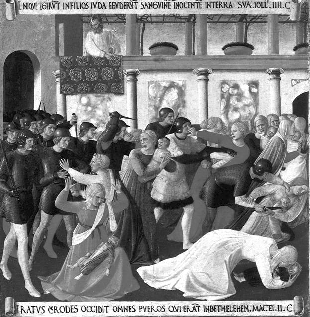 Ирод понял, что реальная опасность существует. Он тотчас отправил в Вифлеем воинов с приказом: забрать у родителей мальчиков в возрасте до двух лет и предать их смерти. Среди младенцев, по его мнению, должен был находиться также Иисус. Воины отправились в Вифлеем и выполнили страшный приказ своего царя. В городе стоял стон и плач. Убитые младенцы были первыми страдальцами, пролившими невинную кровь за Христа. Ироду доложили о содеянном, и он успокоился.