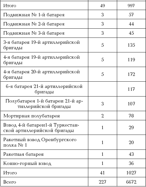 Итого 4¼ рот, 2 команды, 1½ сотни, 4 орудия, 1 картечница, 5 ракетных станков (Прим. авт.).