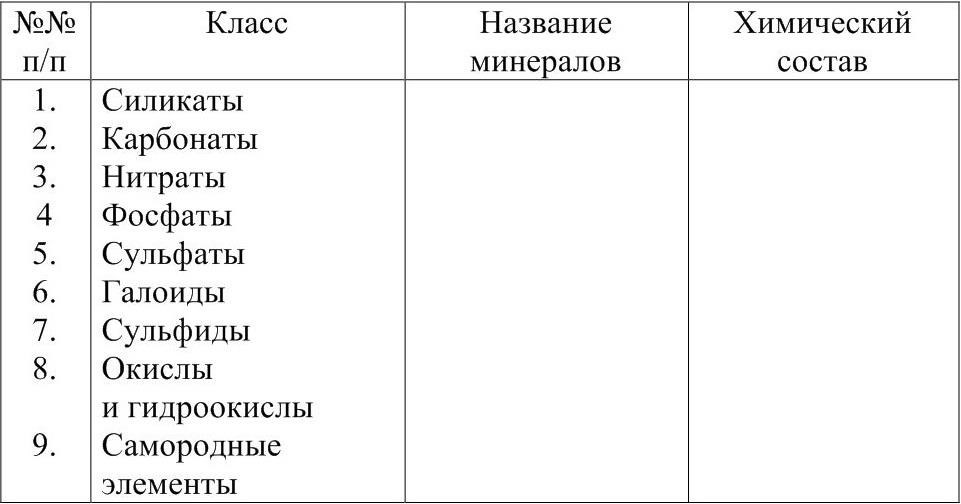 Все минералы систематизируются по химическому составу, что в известной степени предопределяет их особенности и некоторые свойства. Выделяются девять классов: 1) силикаты, 2) карбонаты, 3) нитраты, 4) сульфаты, 5) фосфаты 6) окислы и гидроокислы, 7) галоиды, 8) сульфиды, 9) самородные элементы. Эти классы подразделяются на подклассы и группы.