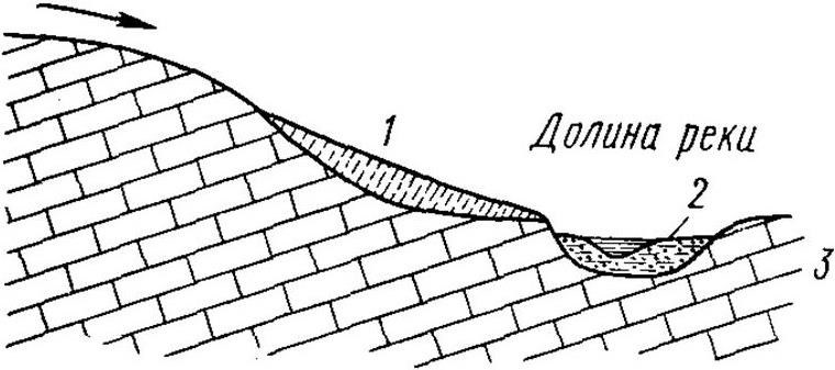 Рисунок 5 – Образование делювия: 1 – делювий; 2 – аллювий; 3 – коренные породы