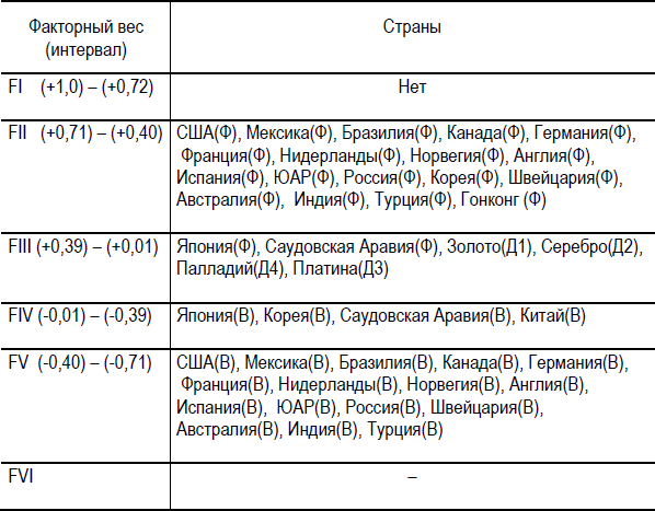 Примечания. К странам G14 добавилось еще шесть стран, поскольку данные по фондовому, валютному рынкам и рынкам драгоценных металлов имеют более высокую степень сравнимости по странам. Символами от FI до FVI отмечены интервалы значений факторных весов; Ф – фондовый рынок; В – валютный рынок; Д1 – рынок золота; Д2 – рынок серебра; Д3 – рынок платины; Д4 – рынок палладия.