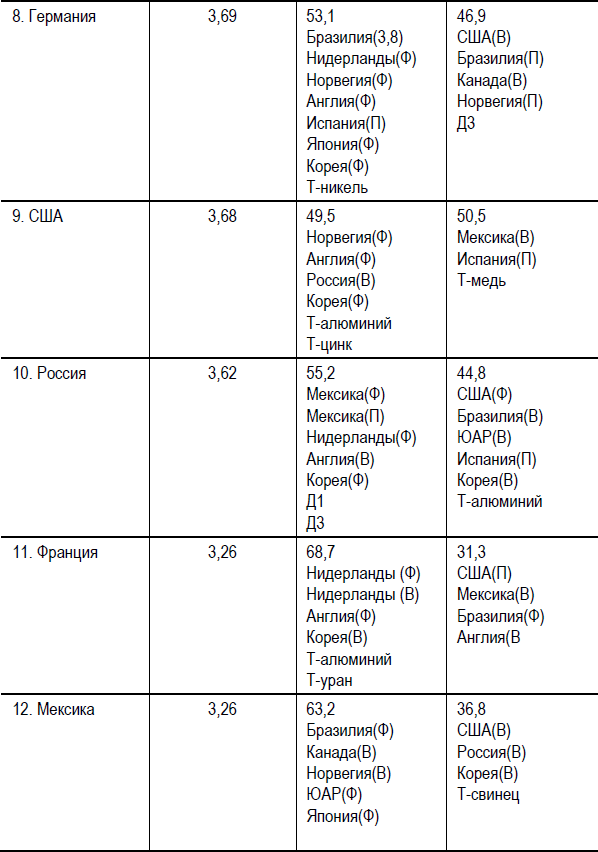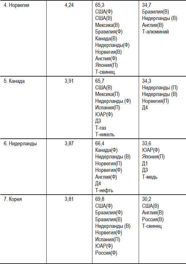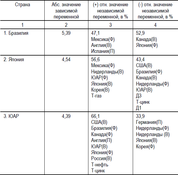 Примечание. П – промышленный рынок, Т – рынок биржевых товаров, В – валютный рынок, Д1 – рынок золота, Д2 – рынок серебра, Д3 – рынок платины, Д4 – рынок палладия. Названия стран и типов их рынков имеют значение выше 3,0 % с соответствующей долей в общем значении. Абсолютные значения зависимой переменной во втором столбце отражают активность и потенциал рынковя, указанных в первом столбце стран. В третьем и четвертом столбцах зафиксированные данные по независимым переменным с разными знаками. Каждая из стран в таблице поочередно является то зависимой, то независимой переменной.