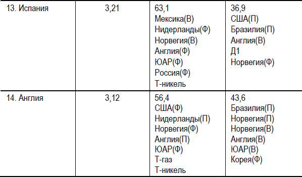 Если сравнивать данные таблиц 2 и 4, то получается, что в среднем промышленные рынки имеют более высокий уровень развития по сравнению с состоянием фондовых рынков в странах G14.