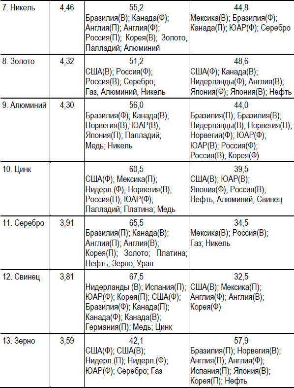 Примечание. В первой колонке указаны названия товарной позиции, во второй колонке обозначены абсолютные суммарные значения коэффициентов уравнений множественной регрессии независимых переменных, влияющих на зависимую переменную – товарную позицию, которые суммарно отражают потенциал и активность этого типа товарной позиции. В третьей колонке зафиксированы положительная суммарная доля (+) влияния независимых переменных на зависимую. В третьей колонке обозначена суммарная доля отрицательного влияния на зависимую переменную. Индекс «В» означает валютный рынок, «П» – промышленный, «Ф» – фондовый. По обозначенным товарным позициям доля влияния на зависимую переменную является значимой и колеблется от 3,0 % до 12,5 %.