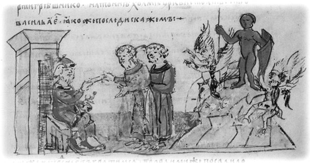 Княжение Владимира в Киеве. Справа Перун в окружении бесов. Миниатюра Радзивилловской летописи. XV в.