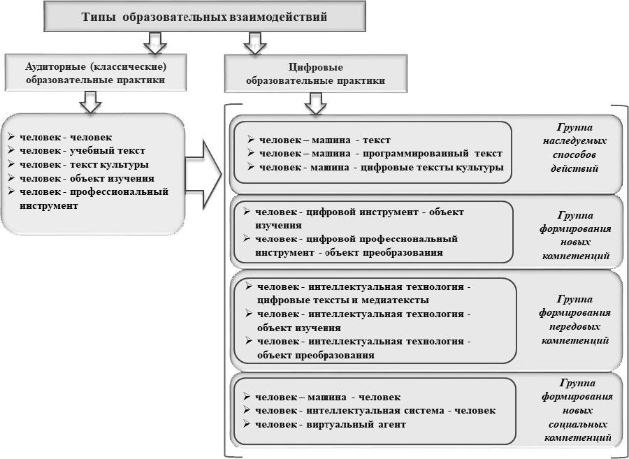Рис. 1. Типы образовательных взаимодействий в аудиторной и цифровой образовательной среде