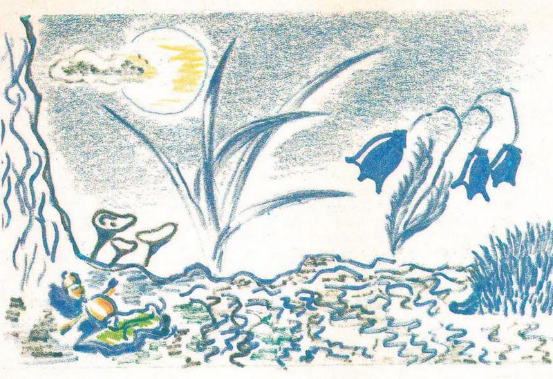 Тут Зюка набралась смелости и выглянула из-под листка. В белом лунном свете мимо нее прошлепала по сырой траве большая глазастая жаба.