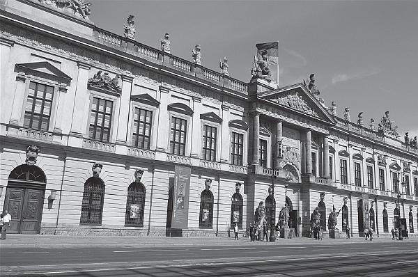 Zeughaus – старейшее сооружение на Унтер ден Линден. Курфюрст Фридрих III (с 1701 г. – король Пруссии Фридрих I) пожелал иметь недалеко от своей резиденции отдельное здание арсенала. Здание было построено Антоном Шлютером в стиле севернонемецкого барокко в 1695 – 1698 гг. и богато декорировано. На верхней балюстраде находится 12 скульптурных групп, представляющих аллегории – Геометрии, Архитектуры, Инженерии, даже Пожарного и Военного искусства, и т. д. А окна украшены не только растительным орнаментом и шлемами, но и 22-мя масками умирающих воинов, выполненными также Антоном Шлютером. Они производят такое устрашающее впечатление, что, вероятно, именно вследствие его воздействия с 1952 г. в этом здании находится Музей немецкой истории (илл. 8).