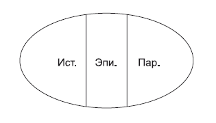 Личность человека с несколькими характерами (смешанным характером) можно представить, например, в виде следующей схемы, где ист. – истероидный компонент, эпи. – эпилептоидный компонент, а пар. – паранойяльный компонент.