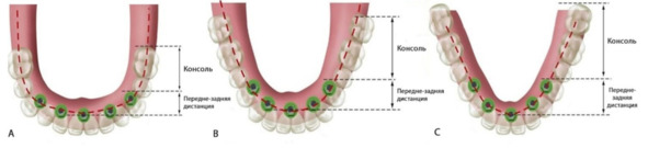 Для овального типа дуги AP (переднезадняя дистанция) составляет от 6 мм до 8 мм, соответственно, консоль в дистальном отделе должна быть представлена одним моляром или премоляром и моляром.