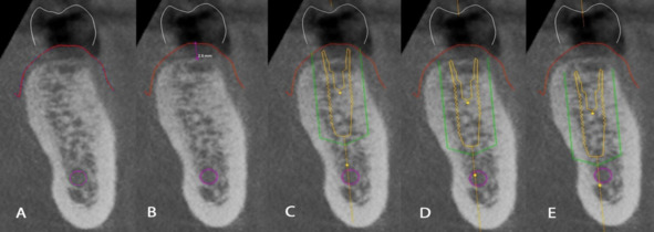 Используя совмещенные данные (КЛКТ, объединенное с поверхностным объемным сканированием), необходимо спланировать расположение имплантата не только с учетом кости, но и с учетом мягких тканей, расположив платформу имплантата таким образом, чтобы ее покрывало не менее 3 мм мягких тканей. Если имеющегося объема мягких тканей недостаточно, можно использовать процедуры менеджмента мягких тканей или выполнить аугментацию мягких тканей либо выполнить резекцию кости для обеспечения места для соединительной ткани и биологической ширины, либо установить имплантат субкрестально (глубже уровня кости).