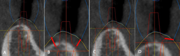 Рис. 1.11. Планирование профиля прорезывания. А, В – имплантат спланирован с обеспечением оптимального контура прорезывания (красная линия). С, D – не оптимальный профиль прорезывания