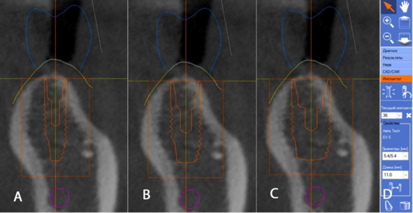 Рис. 1.12. Выбор диаметра имплантата. A – имплантат диаметром 3,0 mm. B – имплантат диаметром 4,2 mm. C – имплантат диаметром 5,4 mm. D – панель выбора имплантата в ПО Galaxis/Galileos Implants