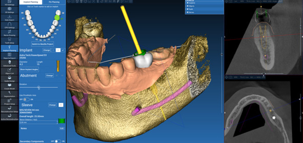 • Размещение имплантатов. В планировщике дентальной имплантации (программное обеспечение для планирования имплантации) загрузить модели используемых имплантатов и расположить их в выбранных местах.