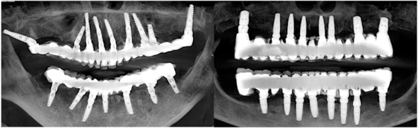 При протезировании полностью беззубой верхней или нижней челюсти с помощью полнодугового протеза с опорой на имплантаты обычными трудностями является недостаток альвеолярной кости, утраченной в результате атрофии альвеолярного отростка. На верхней челюсти это фронтальный участок, потерявший как высоту, так и ширину, а на нижней челюсти это боковые участки, в области которых близость нижнеальвеолярного нерва создает значительные трудности для установки имплантатов.