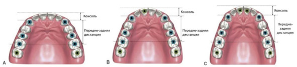 Основное правило гласит: длина дистальной консоли при реставрациях на нескольких имплантатах не должна превышать переднезаднюю дистанцию в 2,5 раза, таким образом, при переднезадней дистанции 10мм консоль, которую мы можем использовать, должна быть не более 25 мм.