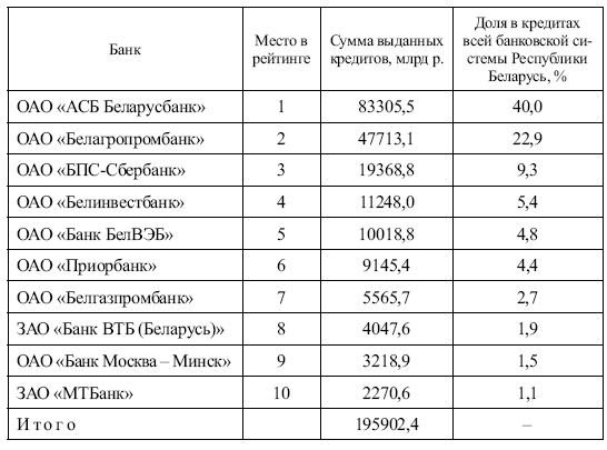 В табл. 1.2 представлено десять белорусских банков, лидирующих в банковской системе по объему привлеченных вкладов клиентов по итогам 2012 г.