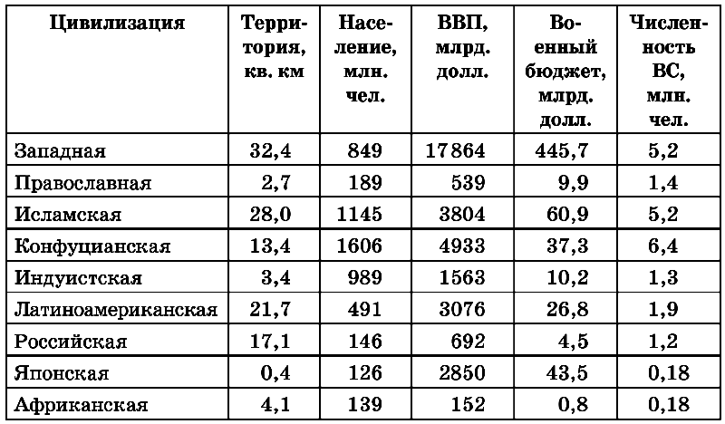 Для того, чтобы целостно представить современные цивилизации, играющие главные роли в мировой геополитике, можно привести следующую таблицу, в которой даны не только названия цивилизаций, но и их сравнительные количественные характеристики (по материалам современного российского геополитика С. Г. Киселева)[76].