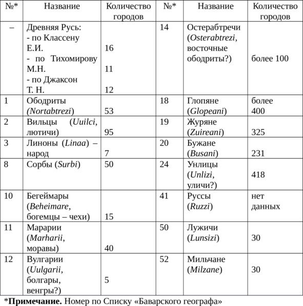 Итак, согласно Классену Е. И. на момент призвания варягов (862 г.) на Руси было 16 городов, по Тихомирову М. Н. – 11 городов, по Джаксон Т. Н. – 12 городов. Не вдаваясь в дискуссию о количестве городов на Руси в IX веке, отметим, что приведенные цифры одного порядка. Оценить много это или мало позволяет, сохранившийся уникальный документ второй половины IX века, получивший название «Баварский географ» (Geographus Bavarus, или Ostfraenkische Voelkertafel – «Восточнофранкская таблица племён», или «Описание городов и земель к северу от Дуная»). Это список народов и племён, преимущественно славянского происхождения, населявших в IX веке области восточнее Франкского государства и насчитывающий около 4000 городов. Из 58 позиций cписка «Баварского географа» для сравнения мы выбрали 15 наиболее знакомых названий славянских племен, которые дают, на наш взгляд, представление о количестве городов в средневековой Европе (табл. 6) [8].