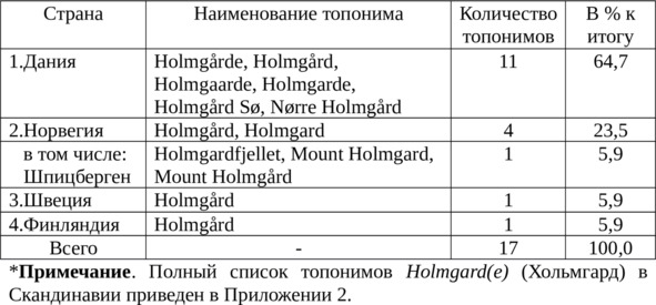 Таблица 7Количество топонимов Holmgard (e) (Хольмгард) по странам Скандинавии*