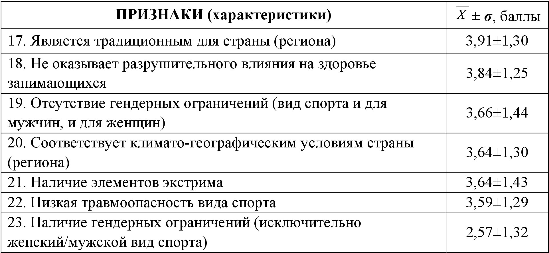 В число показателей, чью значимость опрошенные оценили как «несколько выше средней», вошли характеристики, отражающие соответствие вида спорта традициям и климато-географическим условиям страны (региона).