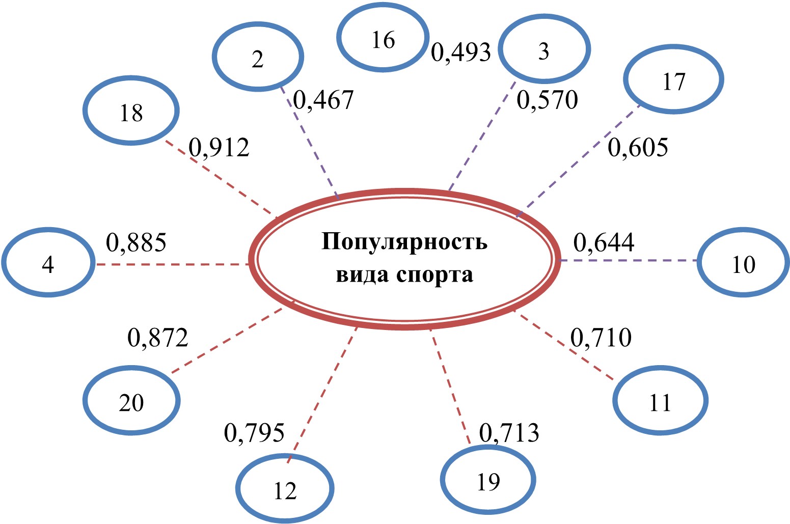 Для уточнения иерархии и списка наиболее важных признаков популярности вида спорта было проведено вычисление коэффициентов корреляции Спирмена между балльными оценками, характеризующими ответы на вопрос: «Как Вы оцениваете степень популярности своего вида спорта для окружающих?» и показателями значимости каждого из 23-х атрибутов популярности (графа 1 табл. 2.5), а затем построена корреляционная плеяда (рис. 2.2).
