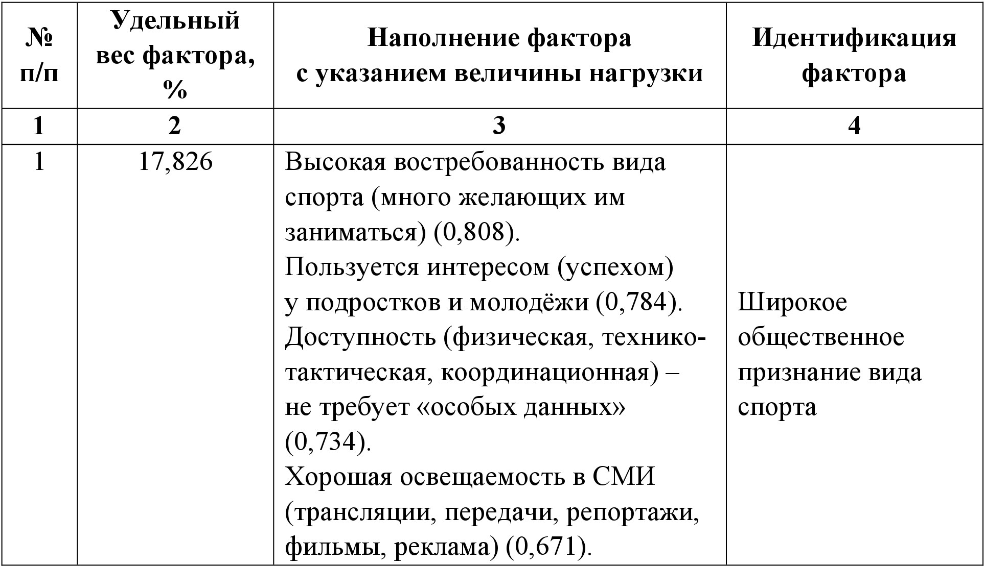 Обработка результатов опросов методом факторного анализа с ротацией референтных осей по VARIMAX-критерию позволила построить статистическую (факторную) модель популярного вида спорта (табл. 2.6).
