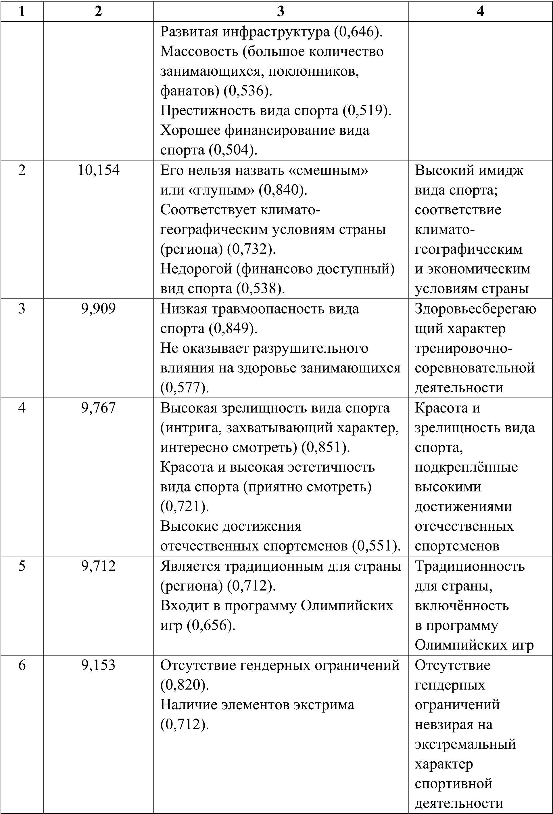Как видно из табл. 2.5, наиболее значимыми признаками популярности вида спорта, по словам опрошенных, являются: востребованность, престижность и массовость вида спорта, его зрелищность, эстетичность и хорошая освещаемость в СМИ, высокие достижения отечественных спортсменов, включённость в программу Олимпийских игр. Также для подростков важно, чтобы этот вид спорта нельзя было назвать «смешным» или «глупым».