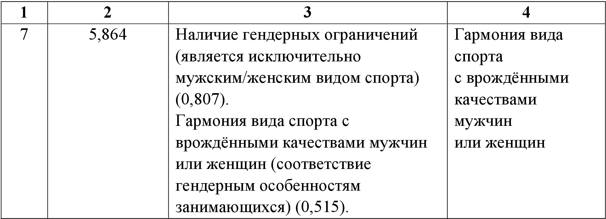 Седьмой фактор с удельным весом 5,864 % идентифицирован как гармония вида спорта с врождёнными качествами мужчин или женщин. Он имеет в своём составе два признака: наличие гендерных ограничений (вид спорта относится к числу исключительно женских или мужских) и соответствие вида спорта гендерным особенностям занимающихся.