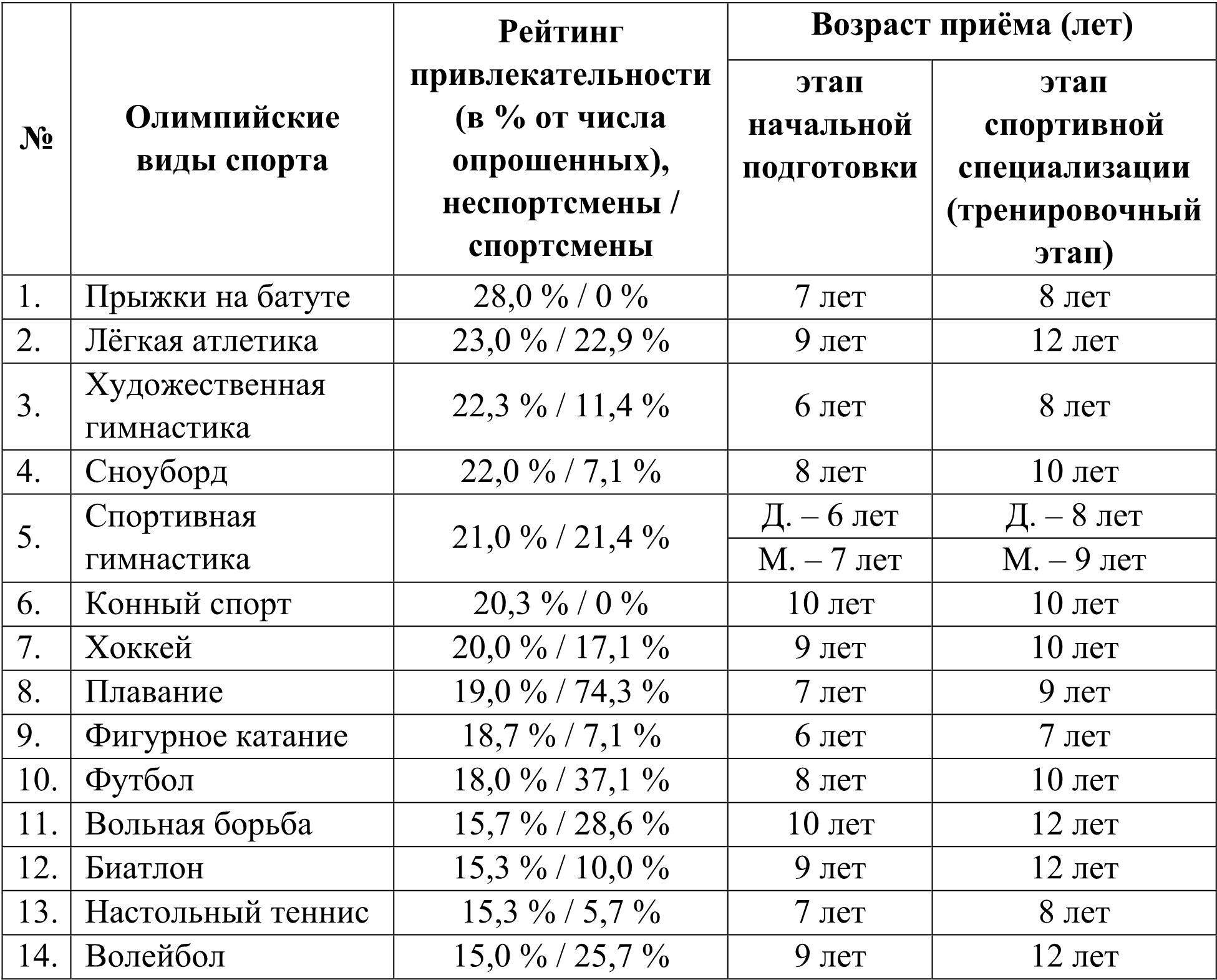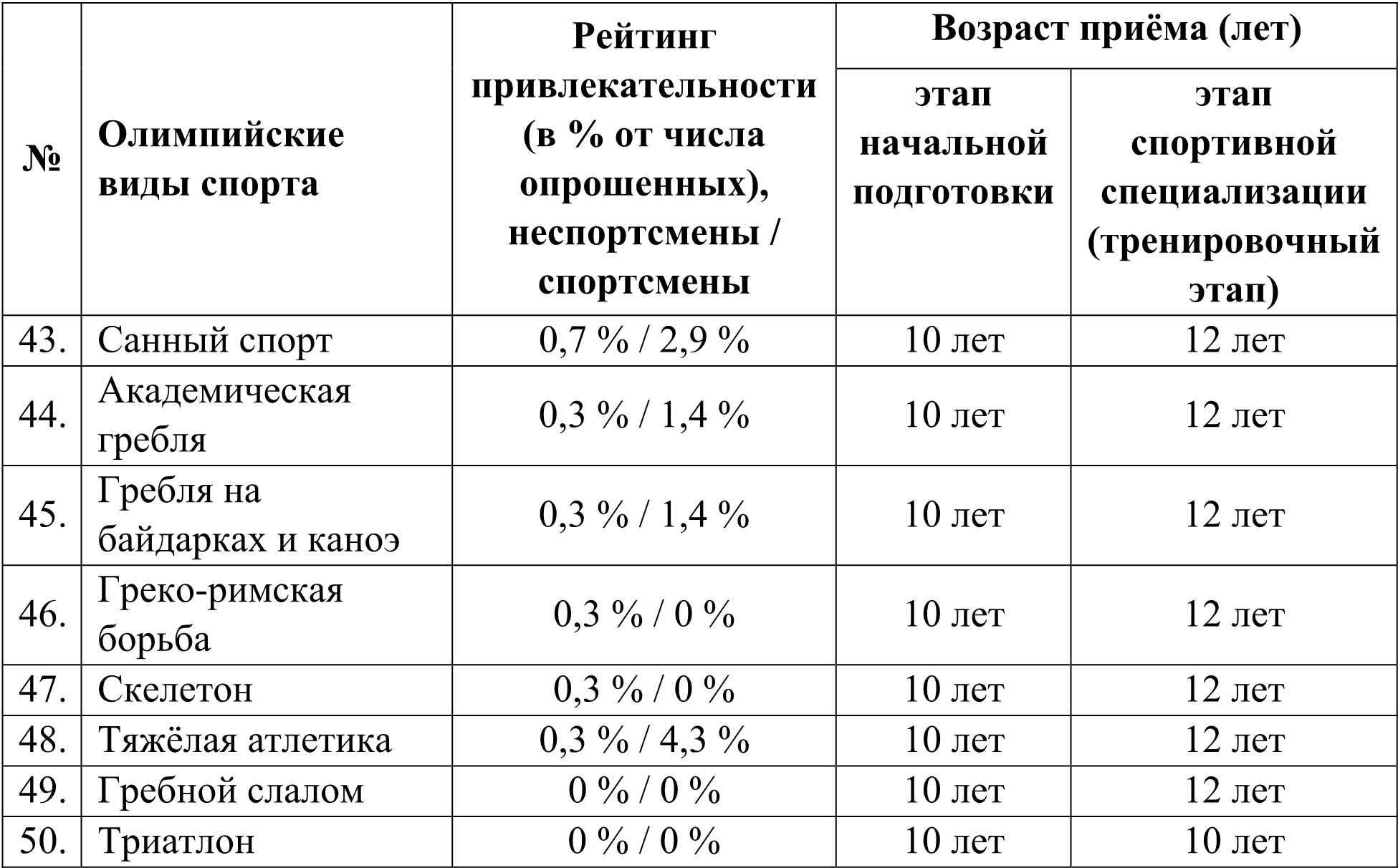 Как видно из табл. 2.7, возраст приёма в спортивные школы и группы, прописанный в нормативных документах, существенно ограничивает свободу подростков в выборе спортивных дисциплин.