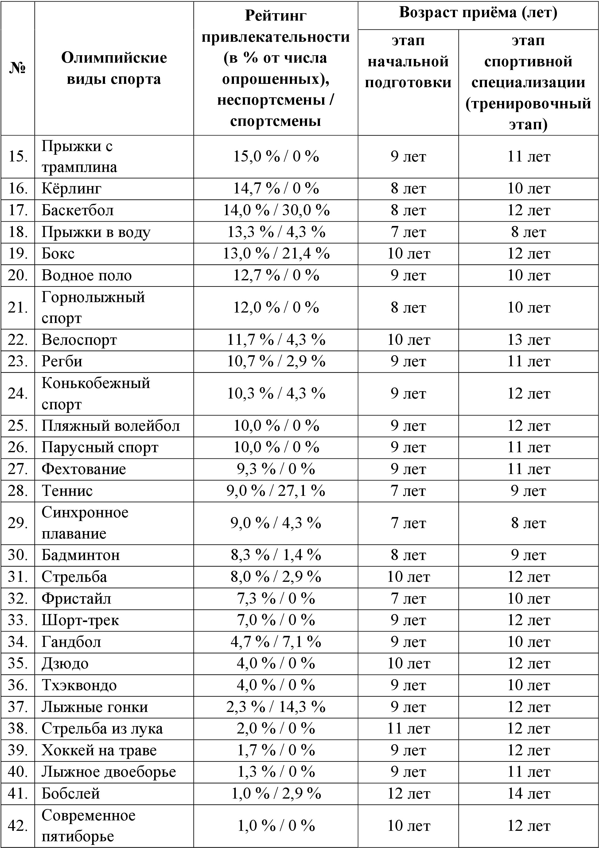Так, согласно Федеральным стандартам спортивной подготовки, младшие подростки (11–12 лет) могут быть зачислены в группы начальной подготовки всего по двум видам спорта – стрельбе из лука и бобслею. Однако эти спортивные дисциплины набирают среди подростков, не занимающихся спортом, 2,0 % и 1,0 % голосов, соответственно. У спортсменов стрельба из лука даже не упоминается в рейтинге привлекательности, а бобслей набирает всего 2,9 % голосов. Что касается неспортсменов, то стрельба из лука расположилась лишь на 38-м месте в рейтинге популярности, а бобслей и того ниже – на 41-м месте.