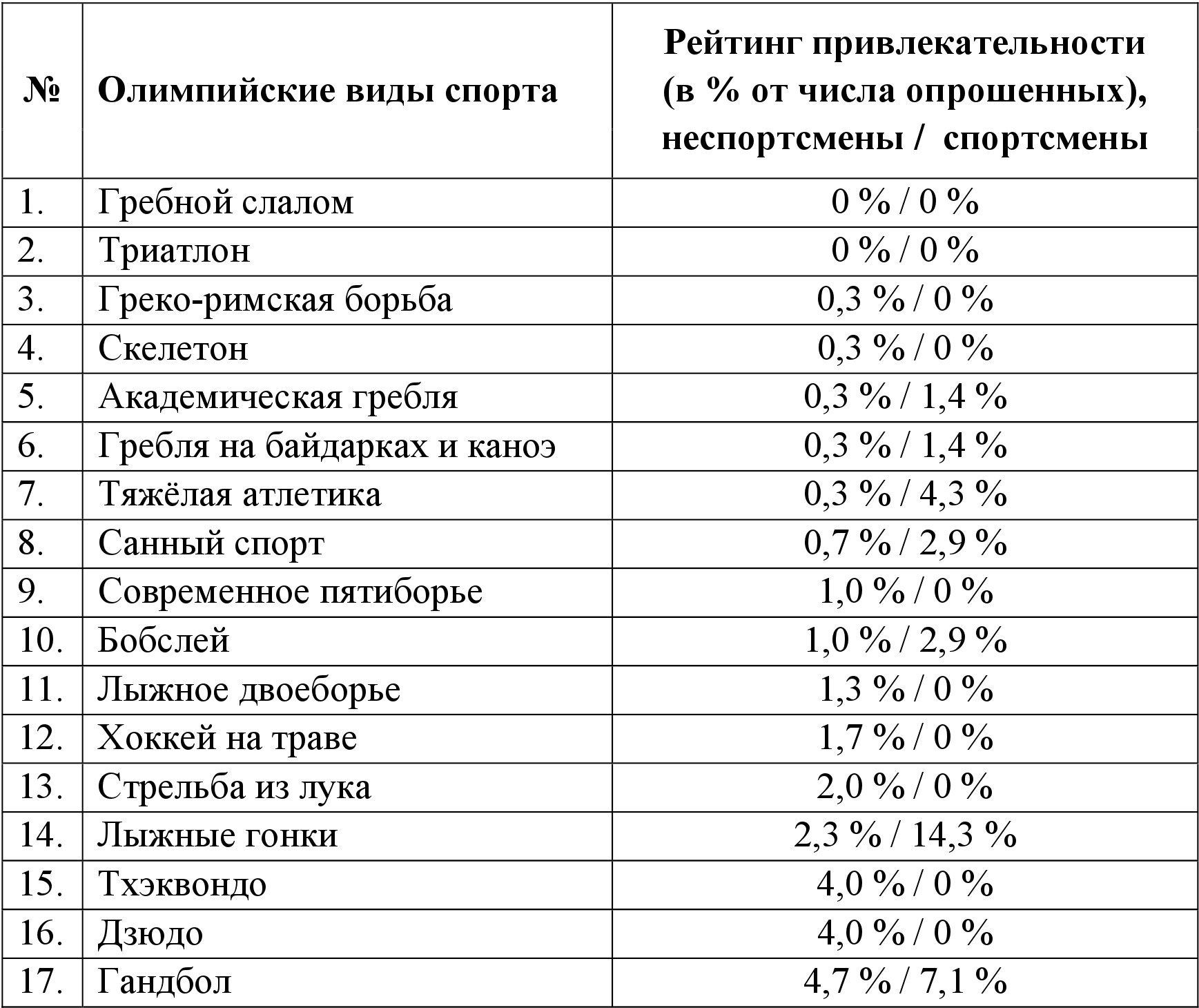 – респондентов-неспортсменов: фехтование, синхронное плавание, теннис, бадминтон, стрельба, фристайл, шорт-трек, гандбол, дзюдо, тхэквондо;