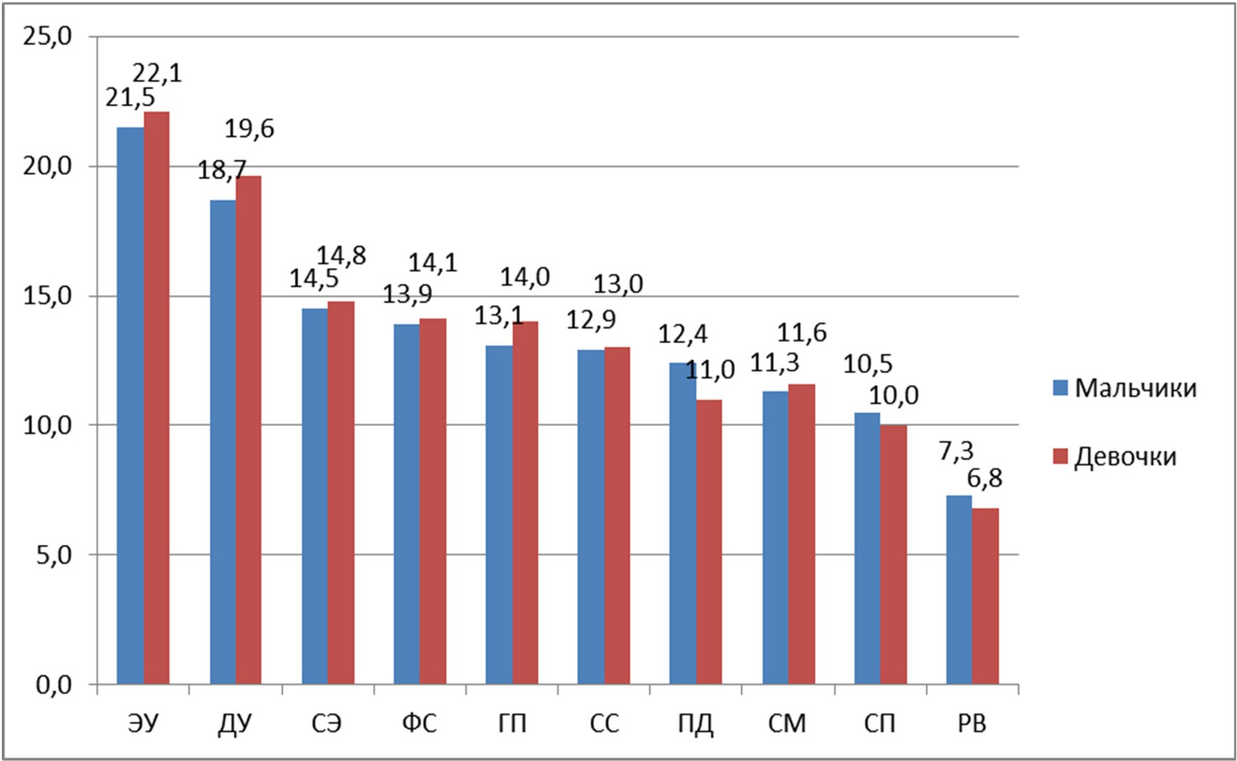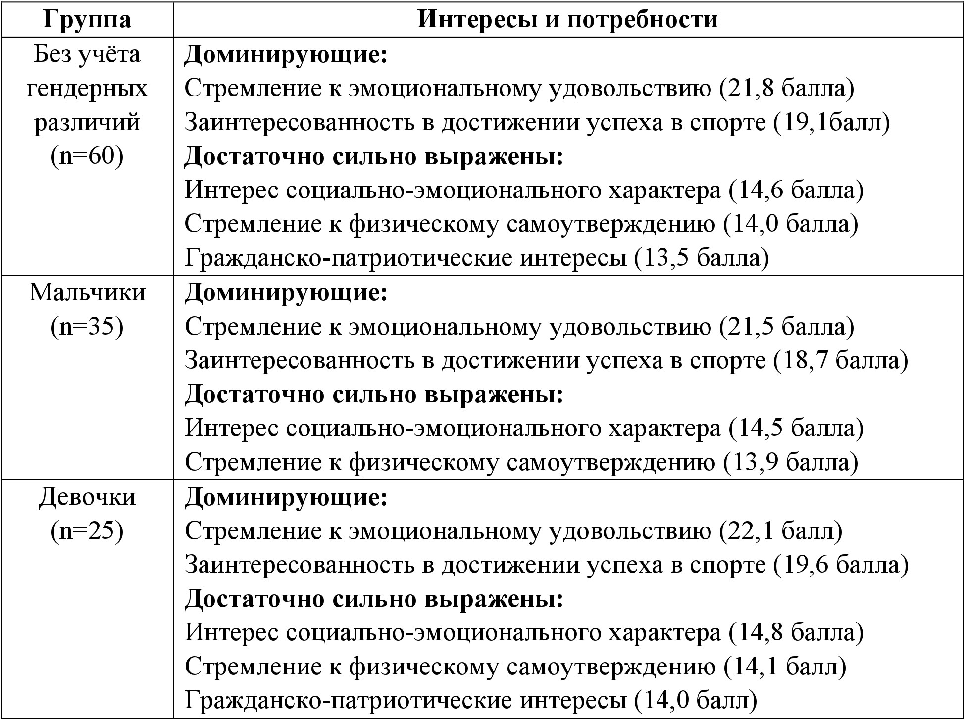 Пояснения: ЭУ – стремление к эмоциональному удовольствию; СС – заинтересованность в социальном самоутверждении; ФС – стремление к физическому самоутверждению; СЭ – интерес социально-эмоционального характера; СМ – интерес социально-морального характера; ДУ – заинтересованность в достижении успеха в спорте; СП – интерес к спортивному познанию; РИ – рациональный интерес; ПД – интерес к подготовке к профессиональной деятельности; ГП – гражданско-патриотические интересы.