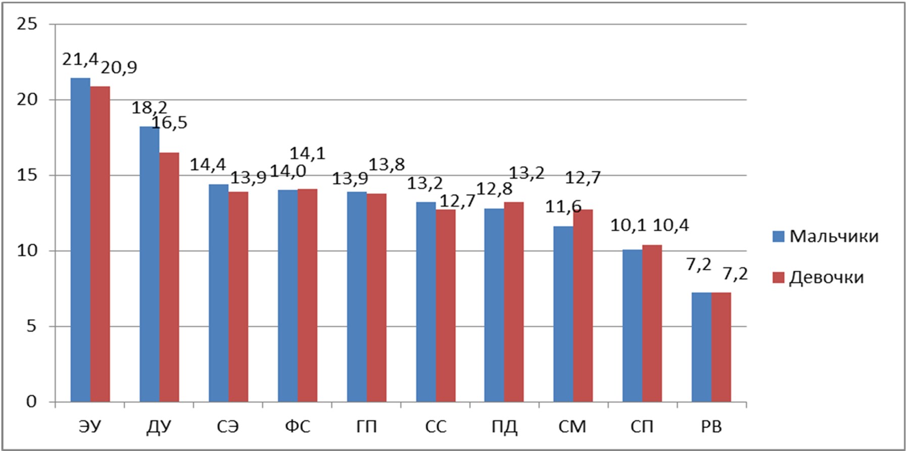 В 11-м классе у юношей достаточно сильно выражен интерес к двигательной активности как средству получения удовольствия от движения и проявления физических усилий, физического совершенствования, становления характера. Девушки более заинтересованы заниматься спортом для достижения успеха, улучшения личных спортивных результатов, подготовки к требованиям будущей профессии.