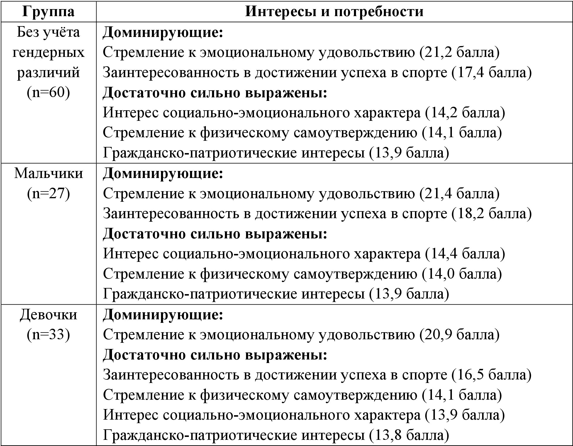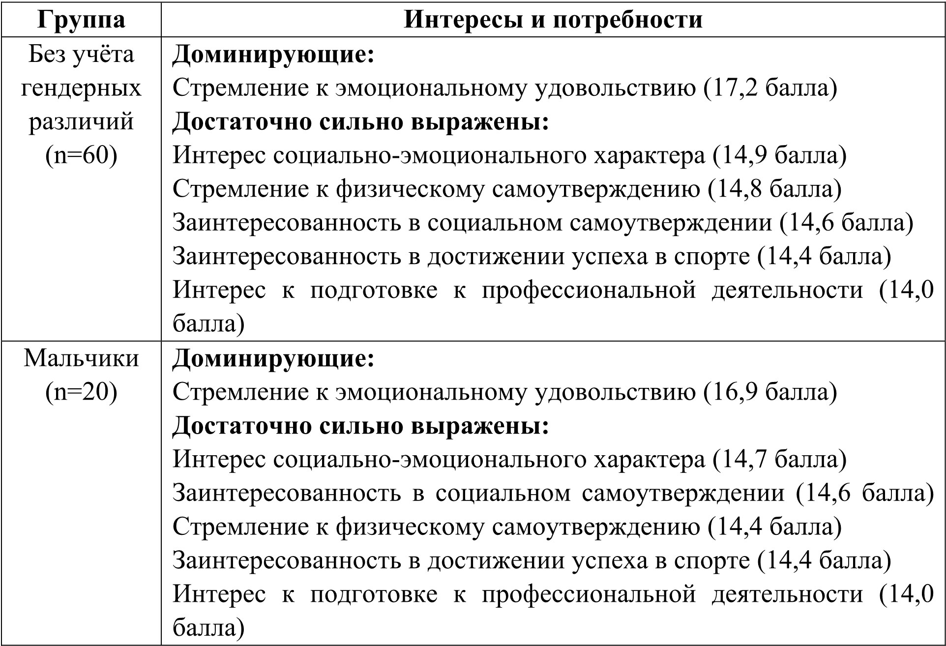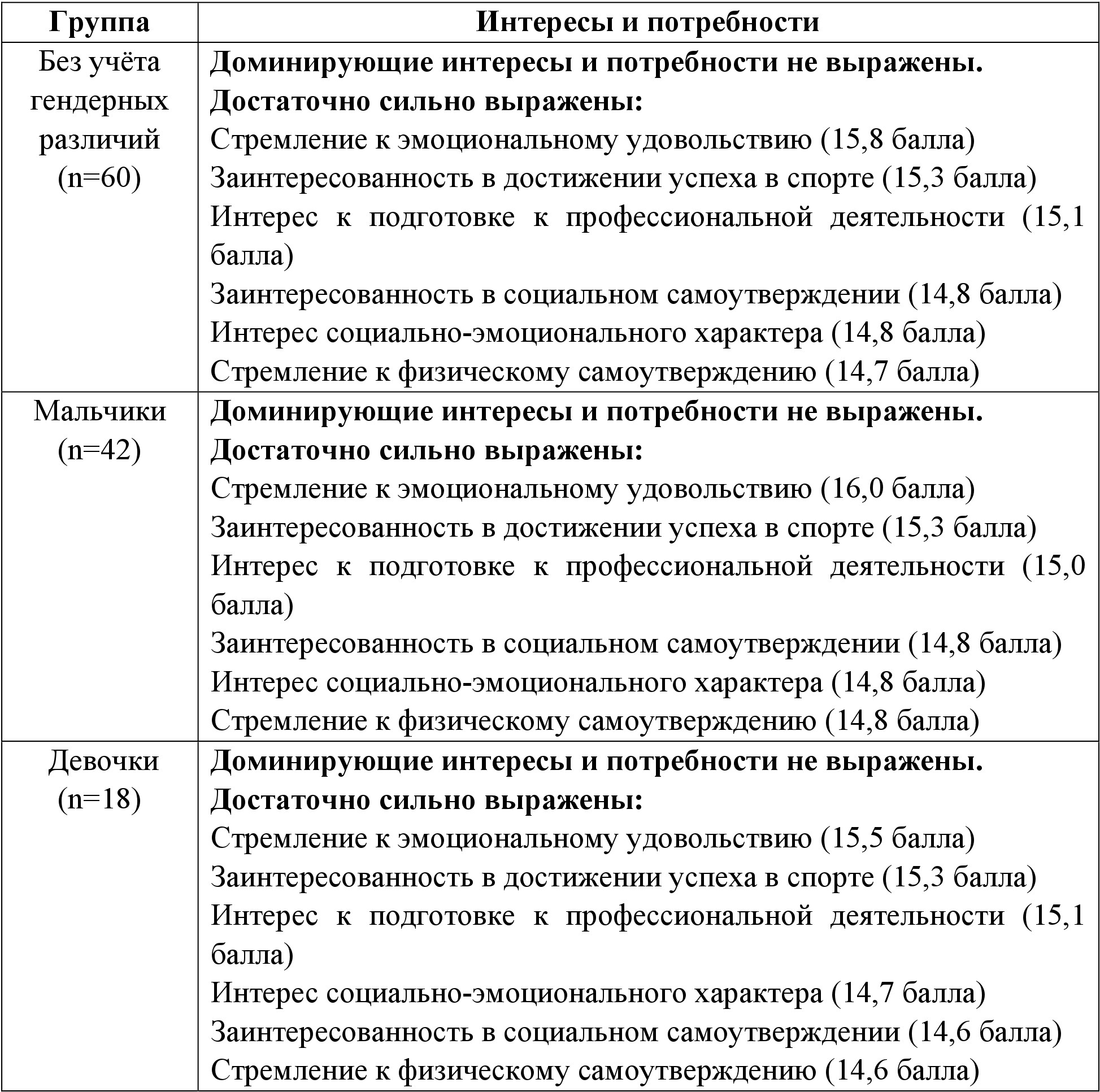 Анализ возрастной динамики интересов и потребностей в спортивной деятельности показал, что у школьников разных лет обучения интересы и потребности в занятиях спортом отличаются по виду и силе выраженности. Если в 7–8 классах обучающиеся занимаются спортом, стремясь к спортивным успехам и получая удовольствие от тренировочно-соревновательной деятельности, то к старшим классам возрастает роль интересов физического и социального самоутверждения, поскольку телесное совершенство и социальный статус высоко ценятся подростками и молодёжью более старшего возраста, что педагоги должны учитывать в своей деятельности.