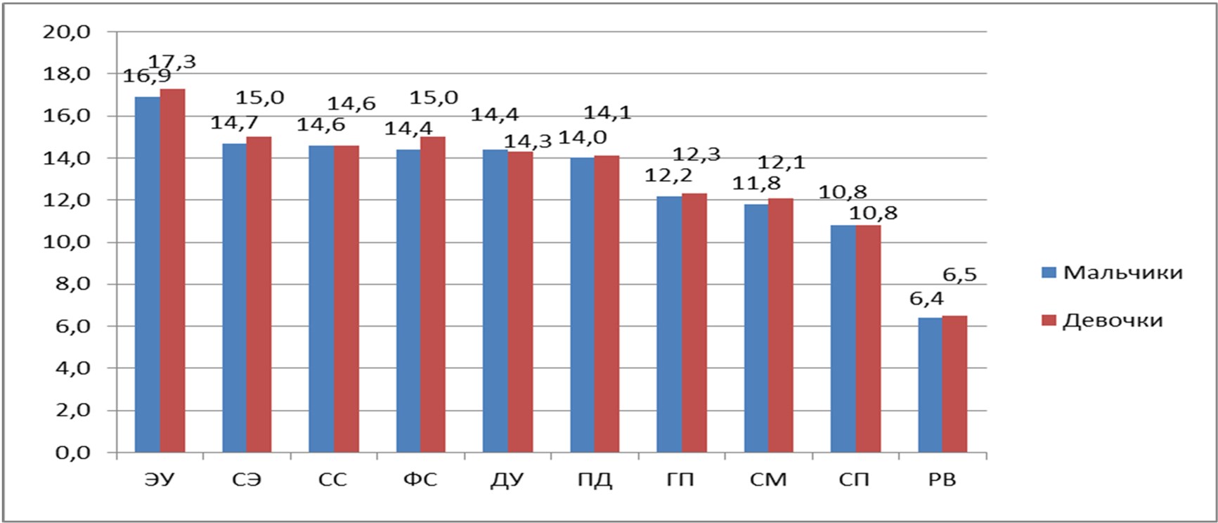 Определённое значение для учащихся 10-х классов имеют гражданско-патриотические (12,2 балла), социально-моральные (12,1 балла) и когнитивные (10,9 балла) интересы. Самым незначимым интересом для десятиклассников оказался рациональный интерес (6,3 балла).