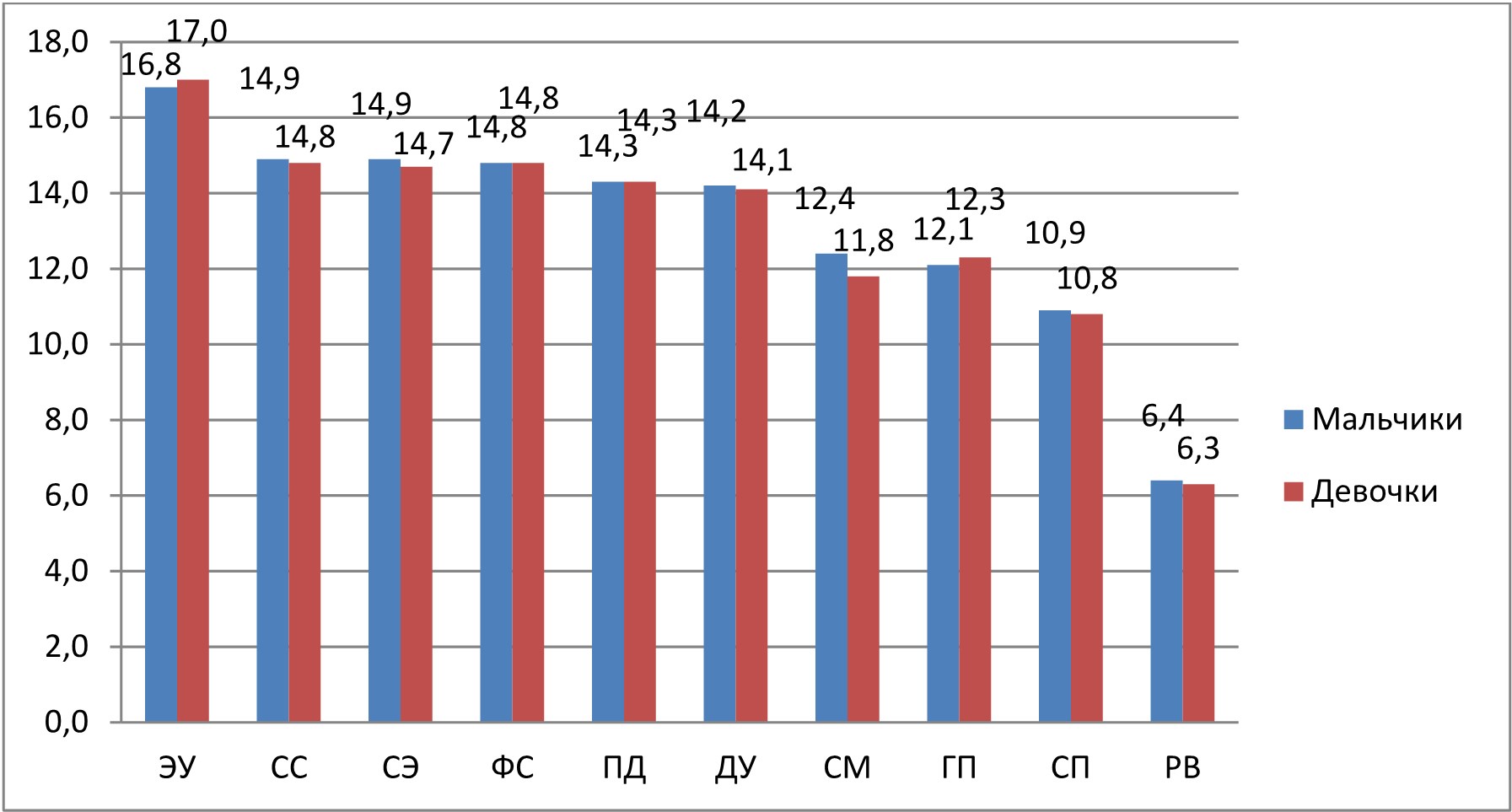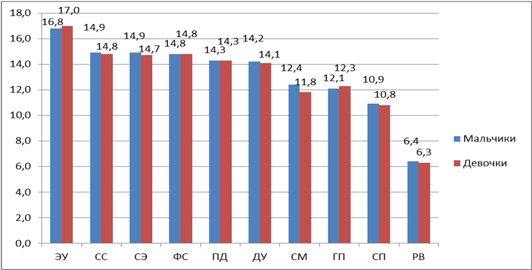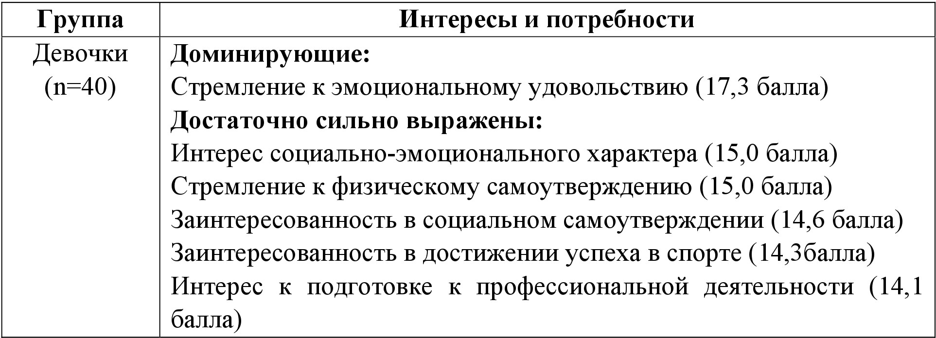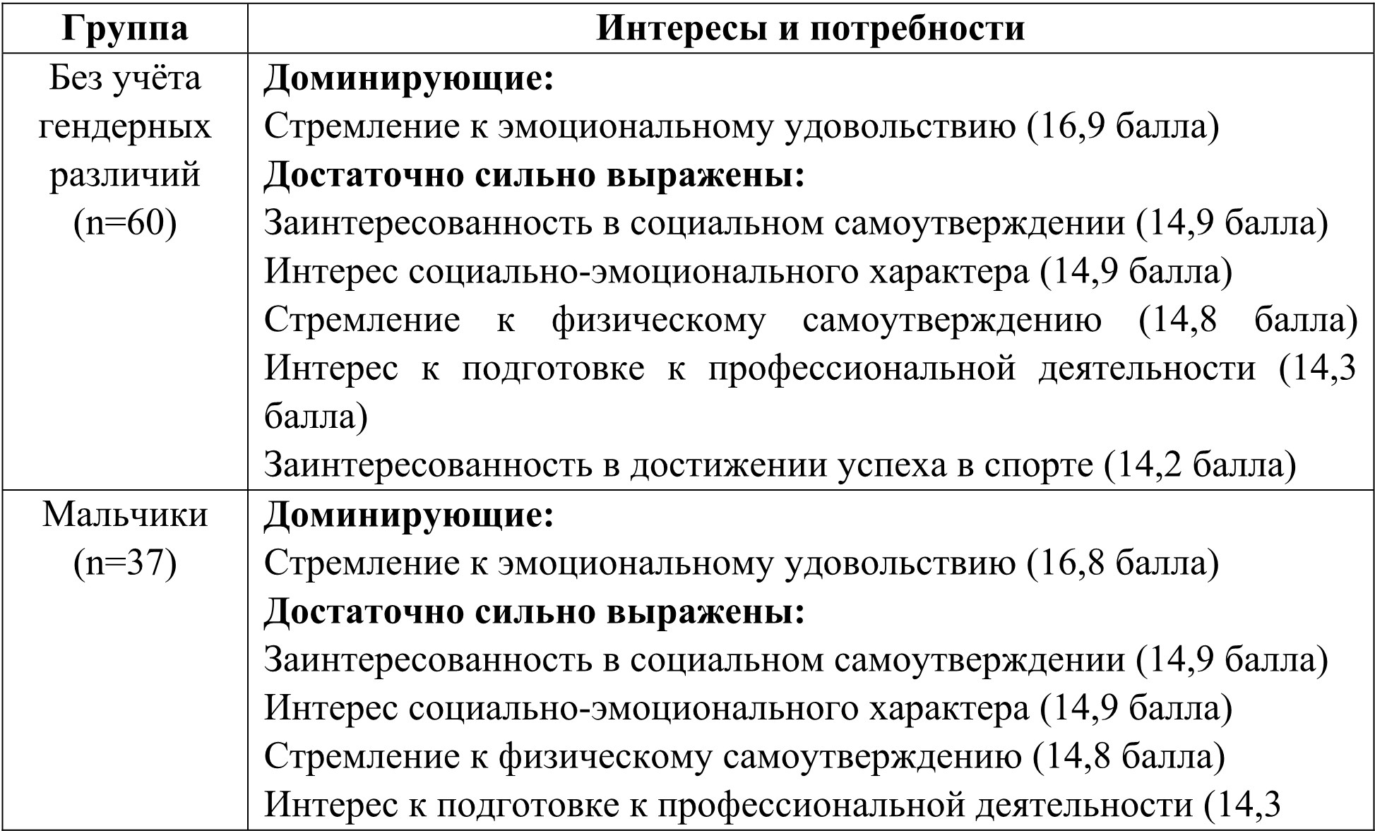 У девятиклассников достаточно сильно выражены интересы: тренироваться и выступать в соревнованиях ввиду их высокой эмоциональности (14,9 балла); к физическому (14,8 балла) и социальному (14,6 балла) самоутверждению; к достижению успехов в спорте (14,4 балла); к спорту как средству подготовки к профессиональной деятельности (14,0 балла). Достаточно выражены у учащихся 9-х классов гражданско-патриотический (12,2 балла), социально-моральный (12,0 балла) и спортивно-познавательный (10,8 балла) интересы. Наименьшей выраженностью обладает рациональный интерес («заниматься спортом для компенсации дефицита двигательной активности») (6,4 балла).