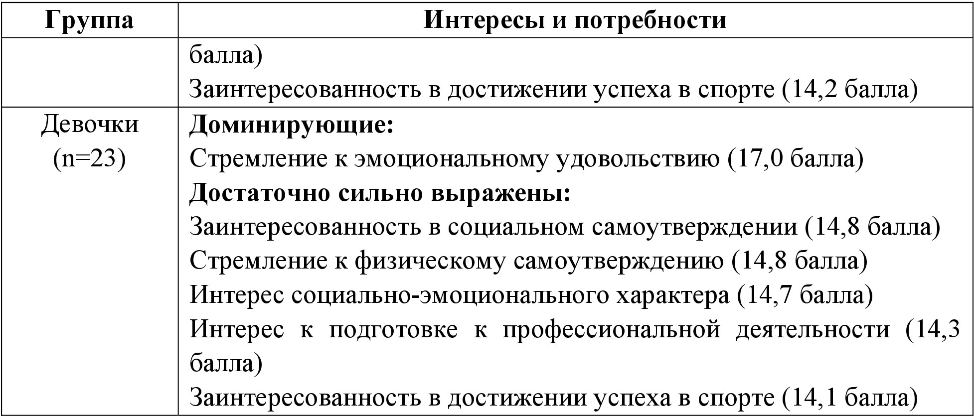 Для восьмиклассников достаточно сильно выражены: интерес к спортивным событиям ввиду их высокой эмоциональности (14,2 балла); интерес к физическому самоутверждению (14,1 балла); стремление к спортивному совершенствованию для успешного выступления на соревнованиях, поддержания престижа коллектива, города, страны (13,9 балла).
