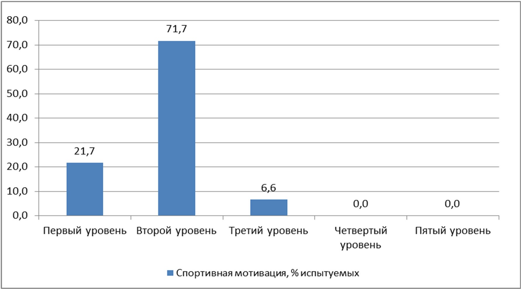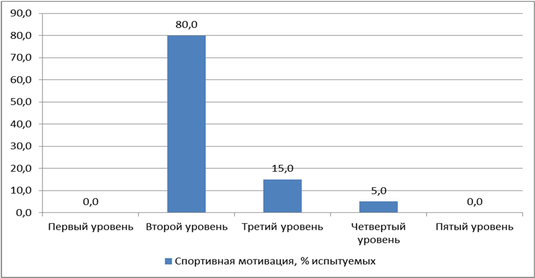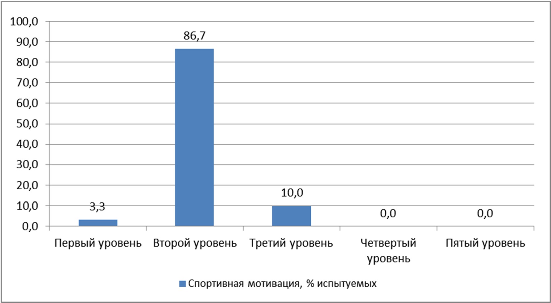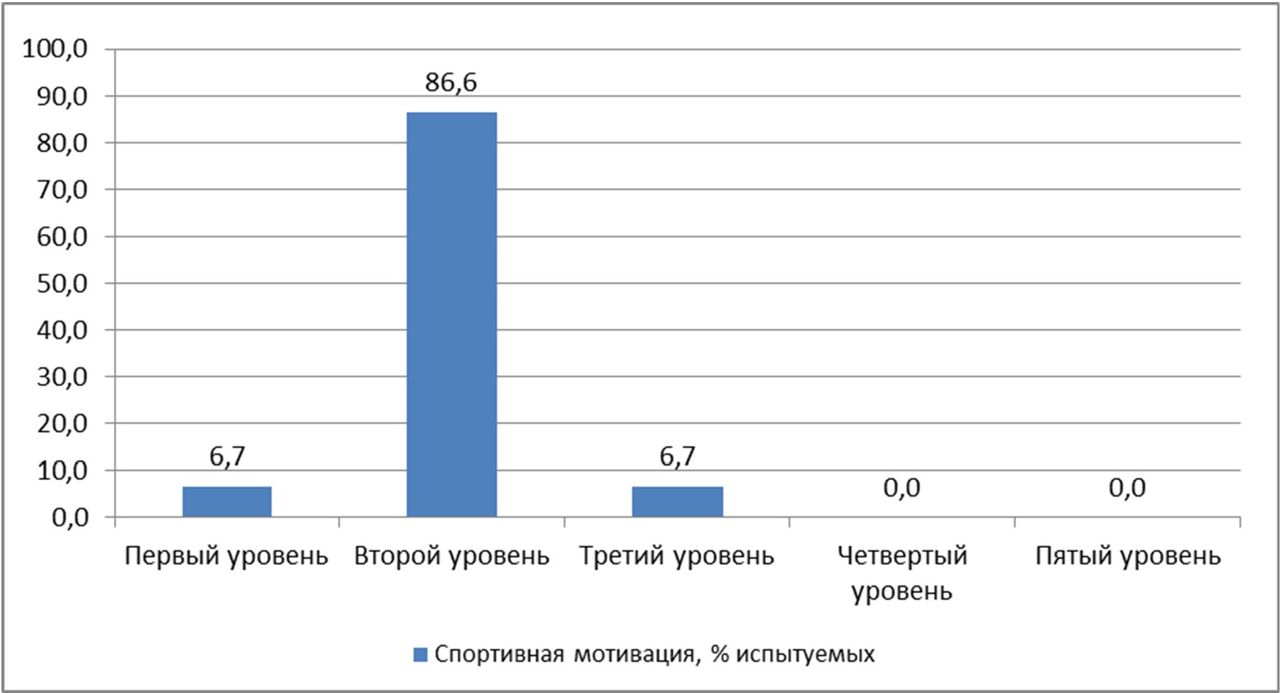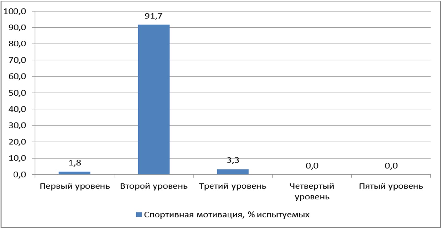 – лишь 3,3 % группы имеет первый (высокий) уровень спортивной мотивации. Эти подростки занимаются спортом охотно, предпочитают не пропускать занятия. На тренировках нацелены на достижение результата, не испытывают затруднений в тренировочно-соревновательной деятельности, чётко следуют всем указаниям тренера, добросовестны и ответственны, сильно переживают, если получают неудовлетворительные результаты;