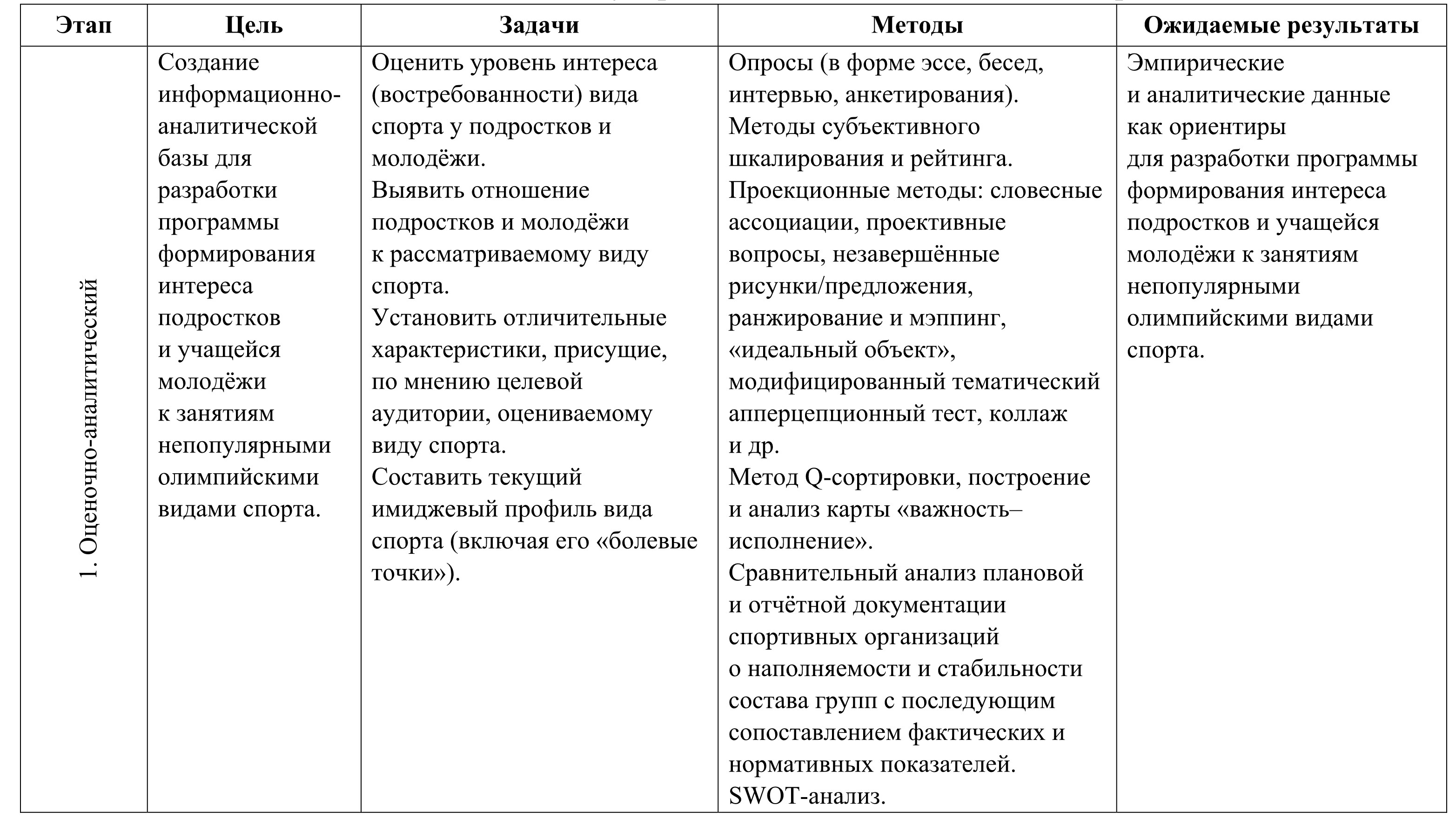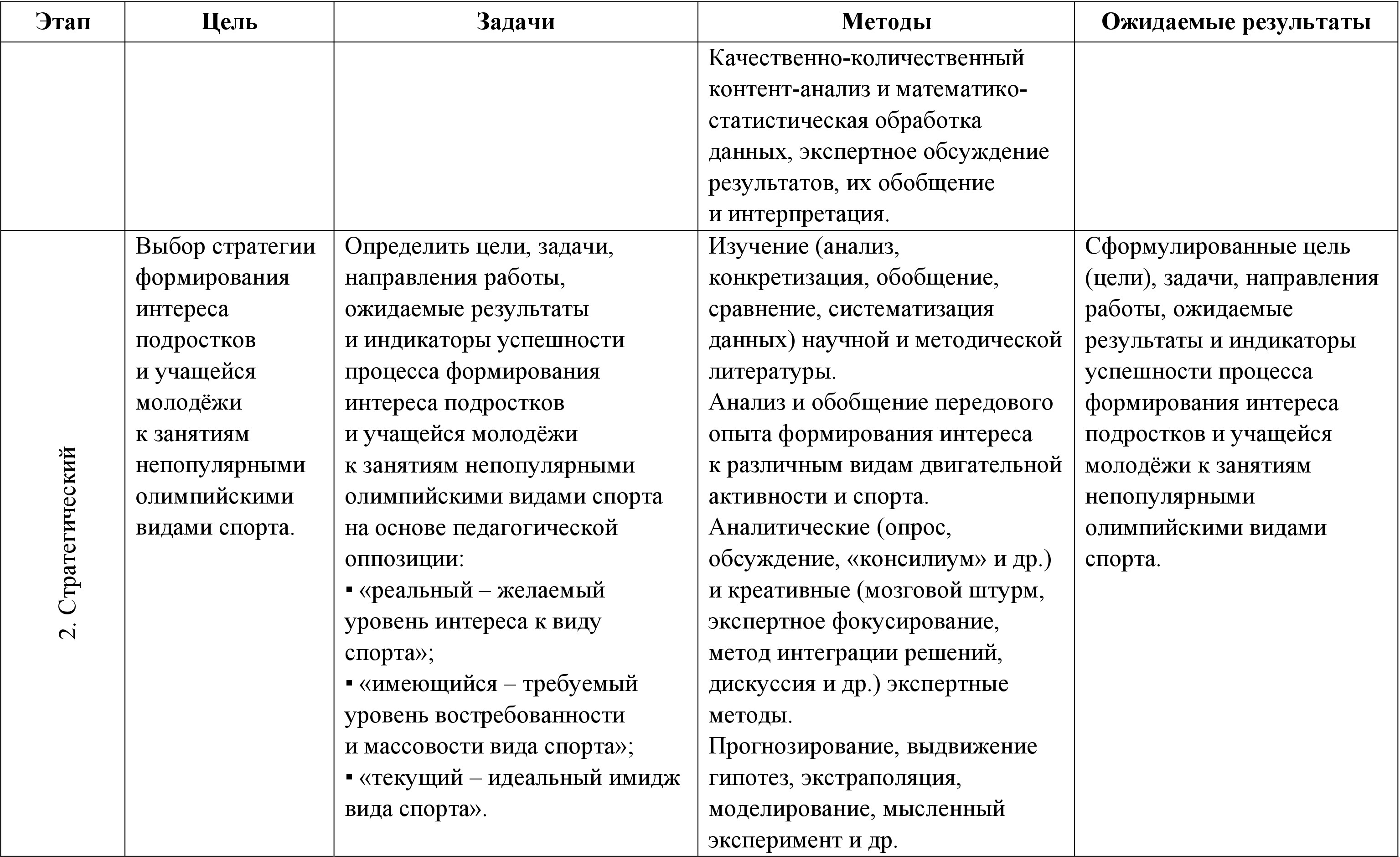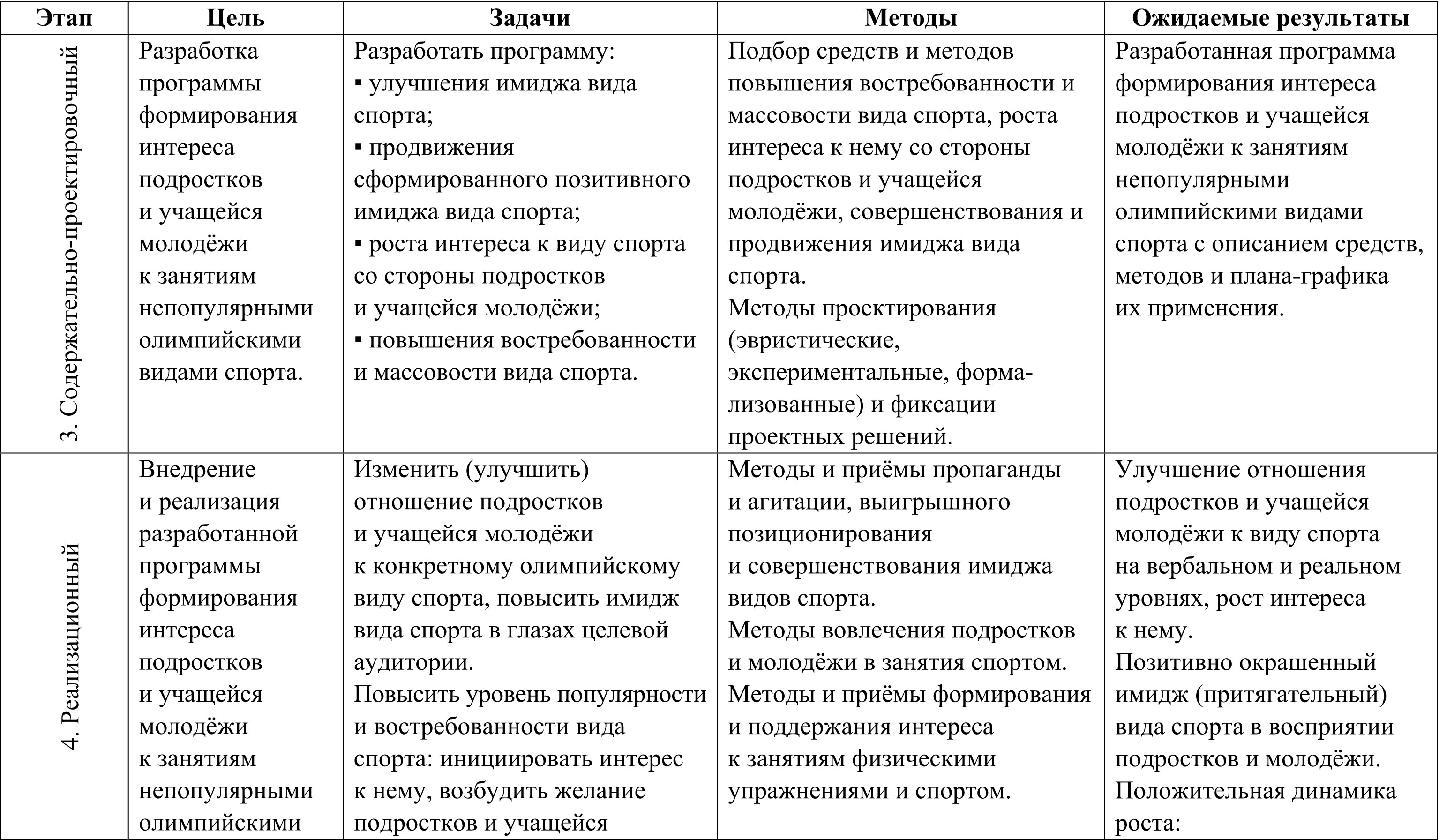 Охарактеризовав сущность этапов формирования интереса у подростков и учащейся молодёжи к занятиям непопулярными олимпийскими видами спорта, представим их в виде технологической карты, где будет представлено описание целей, задач, методов и средств, а также ожидаемых результатов каждого из этапов (табл. 3.1).