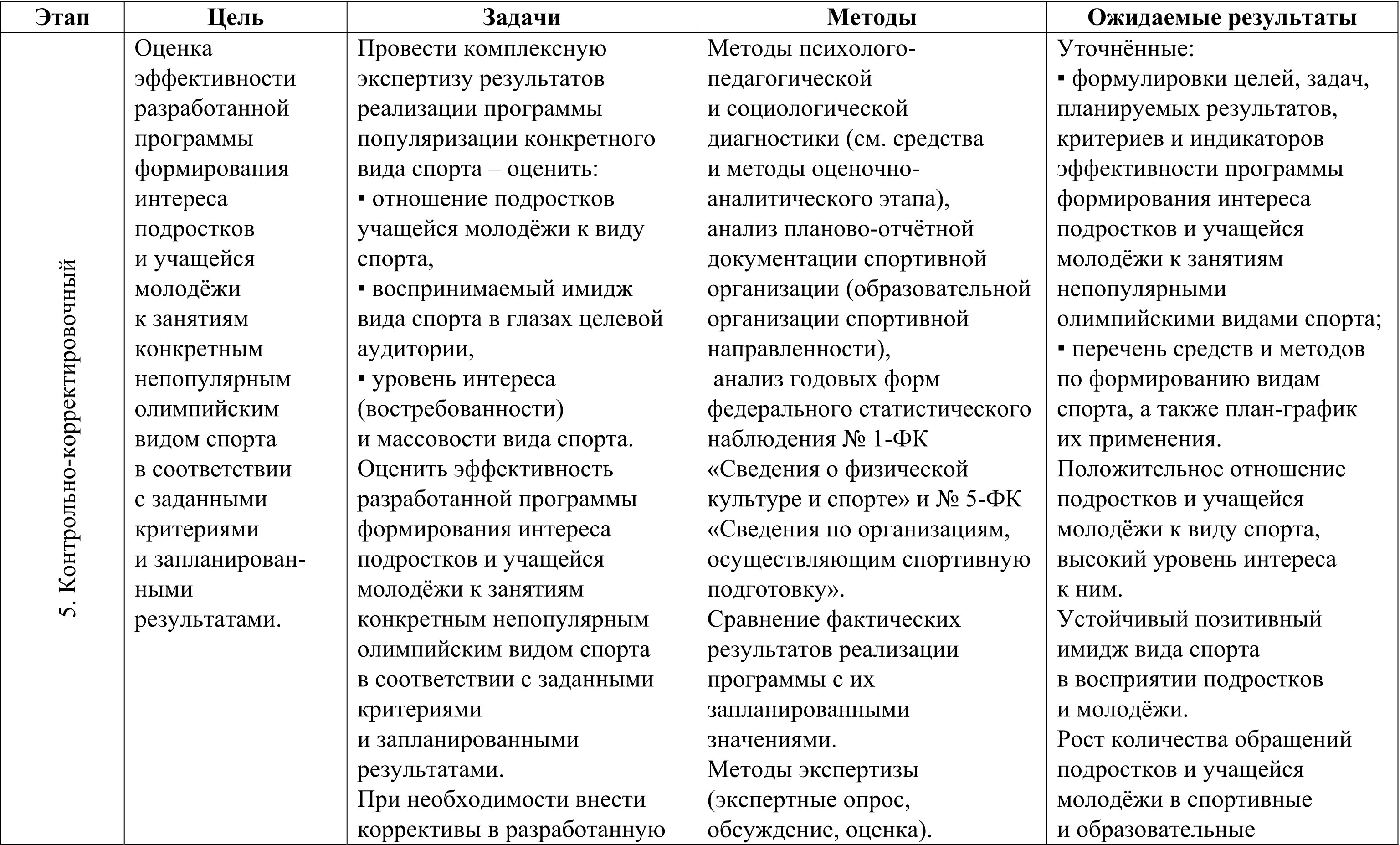 Пятый этап – контрольно-корректировочный. Здесь производится оценка эффективности разработанной программы формирования интереса у подростков и учащейся молодёжи к занятиям конкретным видом спорта в соответствии с заданными критериями и запланированными результатами. При необходимости в программу (перечень и график мероприятий, спектр применяемых средств и методов) вносятся коррективы, призванные обеспечить наиболее полное соответствие планируемых и реально полученных показателей. На данном этапе также возможно творческое переосмысление полученных результатов и появление новых идей.